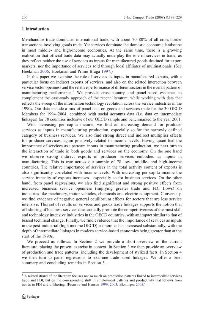 在本文中,我们研究了服务在制造业出口中作为投入的作用,特别关注服务的间接出口,以及服务业开放与不同部门相对绩效在制造业整体绩效格局中的相互作用[1]。我们提供了跨国家和基于小组的证据,以补充最近文献的案例研究方法,同时处理反映1990年代信息技术革命席卷整个服务行业的数据。我们的数据包括经合发组织30个成员国1994-2004年商品和服务贸易的面板数据,以及经合发组织抽样和以2001年为基准的78个国家的社会帐户数据(即中间联系数据)。