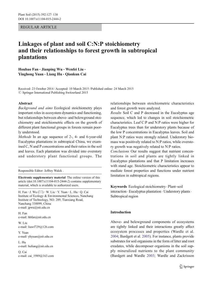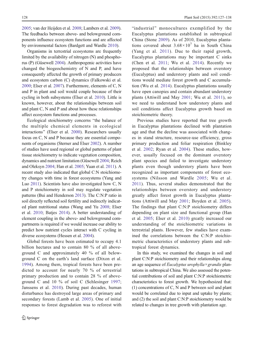 一般认为,全球森林占据了41亿公顷并且包含了百分之八十的地上碳元素以及大约百分之四十的浅层地表地下碳(Dixon et al.1994)。其中热带森林预测占据了百分之七十的陆地初级生产者,包含了百分之地表碳元素以及百分之十的土壤碳元素(Schlesinger 1997;Janssens et al.2010)。在过去的几十年中,人类的干扰活动已经破坏了大面积的原生和次生森林(Lamb et al.2005)。为了应对森林退化,中国亚热带地区实施了桉树纯林的造林措施(Stone 2009)。到2010年,桉树林在中国南部占地大约三千六百八十万公顷(Yang et al.2011)。由于他们频繁地种植,桉树林可能成为一个重要的碳库(Chen et al.2011;Wu et al.2014)。最近我们认为上层树冠(桉树)和林下叶层植物以及土壤状况可能调节森林增长和碳积累(Wu et al.2014)。桉树林通常有开放的树冠并且包含大量林下叶层植物(Attiwill and May 2001;Wu et al.2011),所以我们需要理解基于化学计量学原理,林下叶层植物和土壤情况如何影响桉树生长。