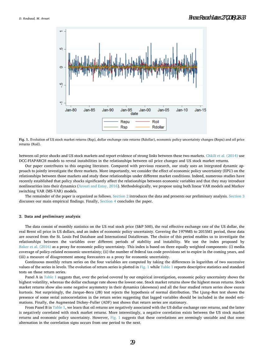 通过采用级别中两个连续值的对数差来计算四个变量的连续月回报系列。返回序列的演变绘制在图1中,而表1报告了对这些返回序列的描述性统计和标准测试。