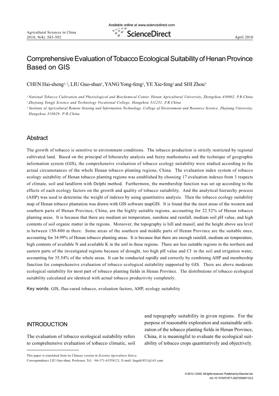 CHEN Hai-sheng1, 2, LIU Guo-shun1, YANG Yong-feng1, YE Xie-feng1and SHI Zhou3
