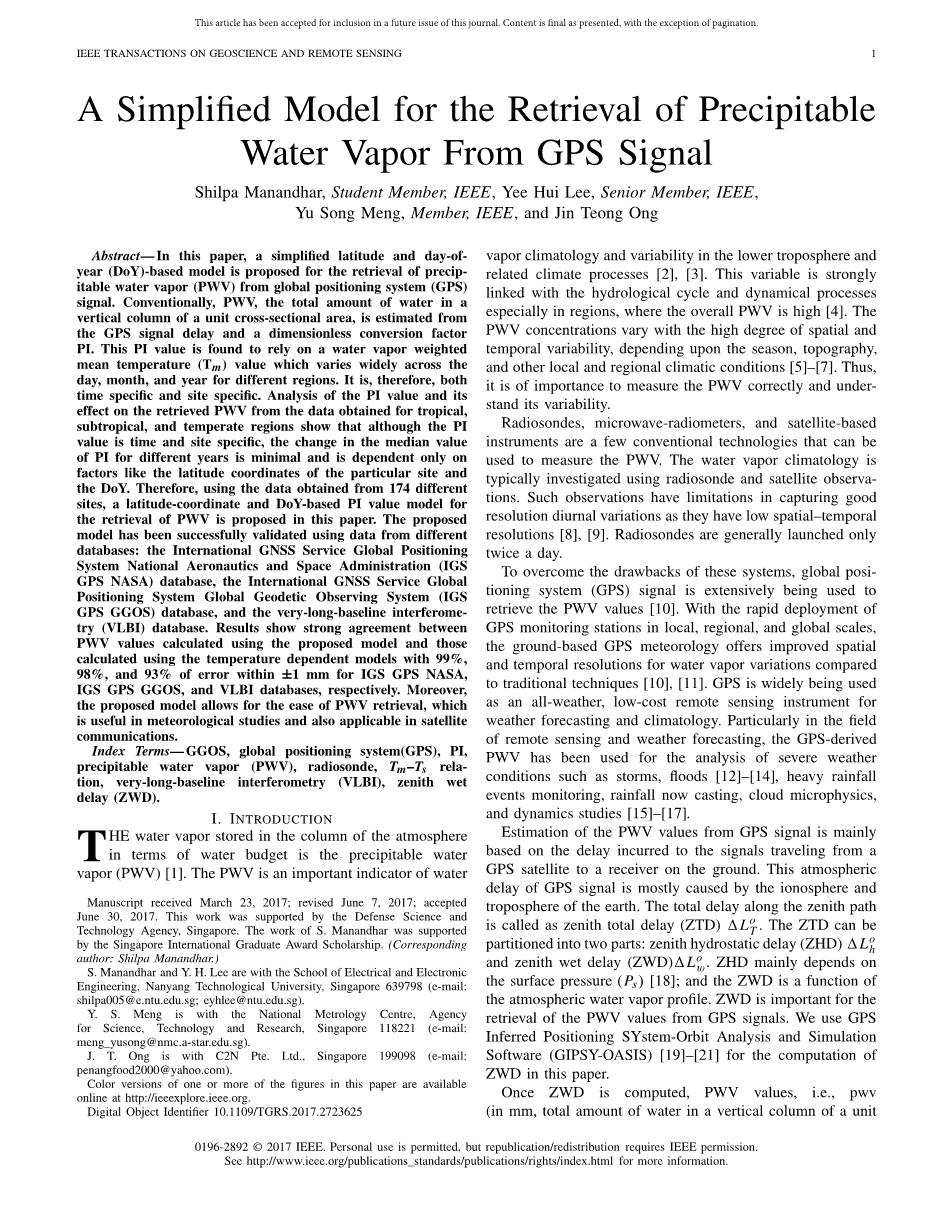摘要 - 本文提出了一种简化的纬度和日年(DoY)模式,用于从全球定位系统(GPS)信号中提取可降水量蒸气(PWV)。通常,根据GPS信号延迟和无量纲转换因子PI来估计PWV(单位横截面积的垂直列中的水的总量)。该PI值被发现依赖于水蒸气加权平均温度(Tm)值,该值在不同地区的一天、一月和一年中变化很大。因此,这既是具体的时间也是具体的地点。从热带、亚热带和温带地区获得的数据中分析PI值及其对取回的PWV的影响表明,虽然PI值是时间和地点特定的,但PI的值在不同年份的变化是最小的,仅取决于特定站点的纬度坐标等因素DoY。因此,本文利用从174个不同地点获得的数据,提出了一个基于纬度坐标和DoY的PI值模型来检索PWV。所提出的模型已经使用来自不同来源的数据成功地进行验证数据库:国际GNSS服务全球定位系统美国国家航空航天局(IGS GPS NASA)数据库,国际GNSS服务全球定位系统全球大地测量观测系统(IGS GPS GGOS)数据库以及超长基线干涉测量(VLBI)数据库。结果显示,使用所提出的模型计算的PWV值与使用温度相关模型分别计算的PWV值在IGS GPS NASA,IGS GPS GGOS和VLBI数据库中分别具有99%,98%和93%误差plusmn;1 mm之间的一致性。此外,所提出的模型允许PWV检索的简易性,这在气象研究中是有用的,并且也可用于卫星通信。