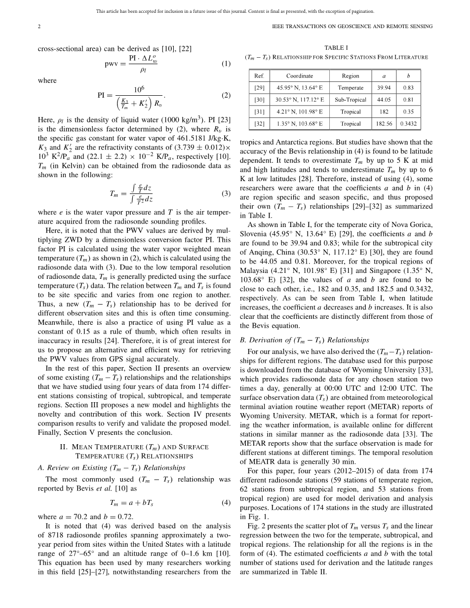 值得注意的是,(4)是基于8718年的无线电探空资料分析得出的,该剖面跨越美国境内约两年的时间,纬度范围为27°-65°,高度范围为0-1.6公里[10],尽管有来自热带和南极地区的研究人员,但该方程已被许多在该领域工作的研究人员使用[25] - [27]。但研究表明,(4)中Bevis关系的准确性与纬度有关。在高纬度地区,它往往会高估Tm达5 K,并倾向于在低纬度时低估Tm高达6 K [28]。因此,一些研究人员不用(4),而是意识到系数a和 (4)中的b是区域特定的和季节特定的,因此提出了它们自己的(Tm-Ts)关系[29] - [32],如表1中所概述。