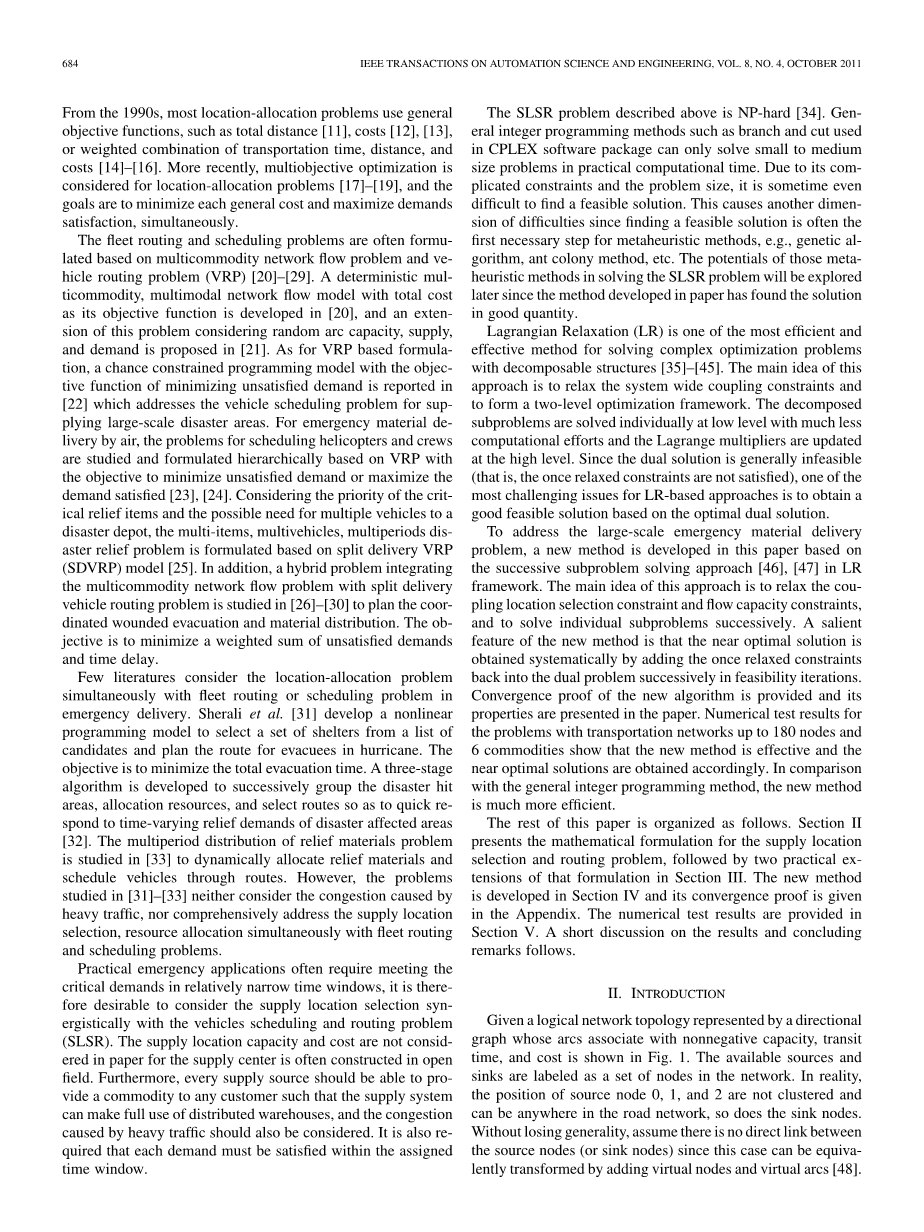 车队路由和调度问题通常是基于多商品网络流问题和车辆路径问题(VRP)[20]-[29]制定的。在文献[20]中开发了以总成本为目标函数的确定性多商品多模态网络流模型,并在文献[21]中提出了考虑随机电弧容量,供给和需求的问题的扩展。至于基于VRP的公式,在相关文献[22]中提出了具有最小化不满足需求的目标函数的机会约束规划模型,其解决了供应大规模灾害区域的车辆调度问题。对于空中紧急物资运送,调度直升机和机组人员的问题是根据VRP分层研究和制定的,目的是最大限度地减少不满足的需求或最大限度地满足需求[23]-[24]。考虑到关键救援物品的优先级以及可能需要多辆车辆进入灾害区,基于拆分交付VRP(SDVRP)模型[25]制定了多项目,多车辆,多期灾难救援问题。此外,文献[26]-[30] 中还研究了将多商品网络流量问题与分体式运输车路径问题相结合的混合问题, 以规划协调伤员疏散和物资分配。目标是尽量减少未满足的需求和时间延迟的加权总和。