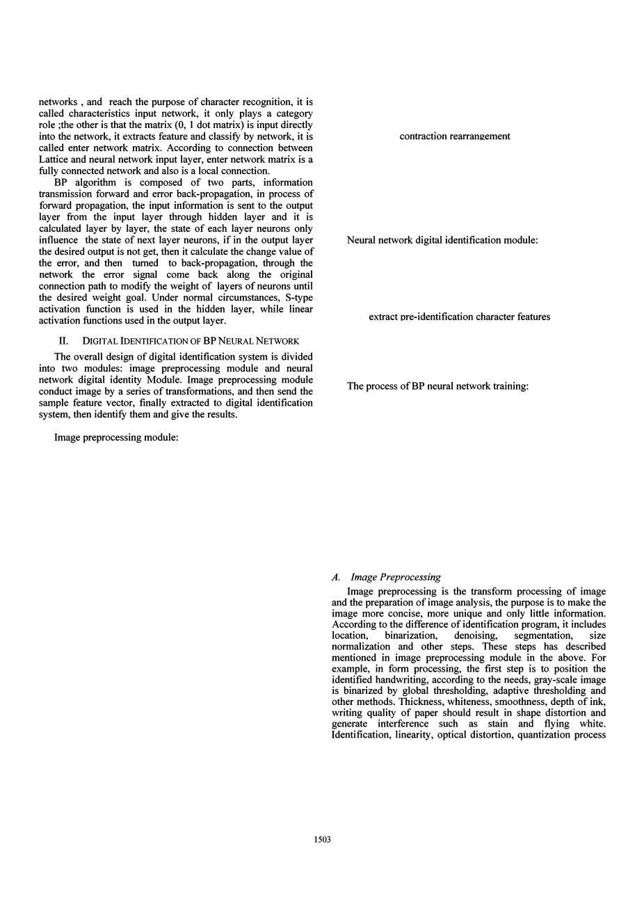 图像预处理是图像的变换处理和图像分析的准备,目的是使图像更简洁,更独特,只有很少的信息。根据识别程序的不同,它包括位置,二值化,去噪,分割,大小规范化和其他步骤。这些步骤已经描述过在上面的图像预处理模块中提到过。对于例如,在表单处理中,第一步是定位确定手写,根据需要,灰度图像通过全局阈值处理,自适应阈值处理和二进制化进行二值化其他方法。厚度,白度,光滑度,墨水深度,写作纸的质量应该导致形状扭曲和产生干扰,如污渍和飞白。 识别,线性,光学畸变,量化过程输入设备也会产生噪音。所以去噪是必要的。字符大小归一化分为线性归一化和非线性归一化,线性归一化本质上是用于缩放字符图像,这种线性转换是 易于数学处理,但只能保证统一输入矢量尺寸并不保持基本形状角色的结构。非线性归一化可以克服这些缺点,但它在规划和制定方面很复杂需要很长时间。它不适用于这种情况强大的实时要求。在图像预处理之后它会产生数字图像样本。