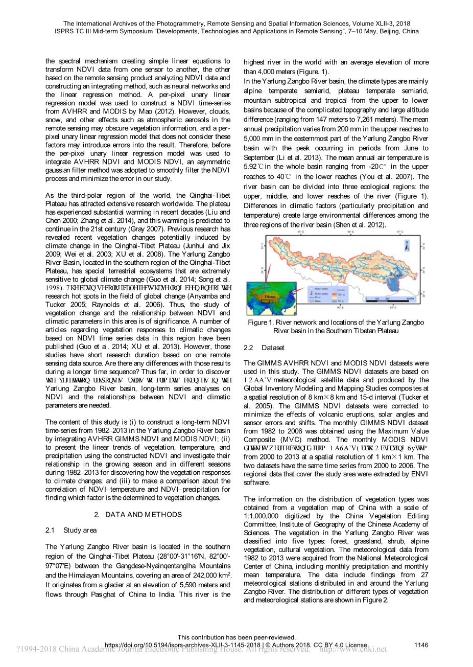 目前,有各种遥感NDVI数据集:MODISNDVI,AVHRRNDVI,SPOTVGTNDVI和TMNDVI。这些数据集来自不同的传感器并具有不同的分辨率和时间顺序。例如,AVHRRGIMMSNDVI的时间序列是从1982年到2006年,而MODISNDVI的时间序列是从2000年到现在。单一数据源对于植被对气候变化的响应研究来说太短,无法实现长期的系列分析。由于AVHRRNDVI和MODISNDVI具有许多相似的特征,并且MODIS数据集需要更新,因此需要开发一种方法,将用于监测植被动态的传统NDVI-AVHRR数据集与新的MODIS数据相结合(GitelsonandKaufman1998)对于两个NDVI数据集,在许多研究中已经讨论了它们的光谱差异和一致性。(Brownetal.2006;Fensholtetal.2009;Tuckeretal.2005)同时采用了几种方法来组合来自不同传感器的数据(Stevenetal.2003)。这些方法可以分为两组:一组基于光谱机制创建简单的线性方程,将NDVI数据从一个传感器转换到另一个传感器,另一组基于遥感产品分析NDVI数据,构建一个积分方法,如神经网络和线性回归方法。使用逐像素一元线性回归模型来构建来自AVHRR和MODIS的NDVI时间序列。然而,云、雪和诸如遥感中的大气气溶胶之类的其他效应可能使植被信息模糊,并且不考虑这些因素的每像素一元线性回归模型可能在结果中引入误差。因此,在使用逐像素一元线性回归模型来整合AVHRRNDVI和MODISNDVI之前,采用非对称高斯滤波方法平滑过滤NDVI过程并最小化我们研究中的误差。作为世界第三极地,青藏高原已吸引了全世界的广泛研究。高原近几十年来经历了大幅度的变暖(LiuandChen2000;Zhangetal.2014),预计这种变暖在21世纪继续(Gray2007)。以往的研究揭示了青藏高原近期气候变化可能引起的植被变化(JunhuiandJix2009;Weietal.2003;XUetal.2008)。雅鲁藏布江流域位于青藏高原南部,具有特殊的陆地生态系统,对全球气候变化极为敏感(Guoetal.2014;Songetal.1998)盆地的生态效应长期以来一直是全球变化领域的研究热点之一(AnyambaandTucker,2005;Raynolds等,2006)。因此,对该地区植被变化的研究以及NDVI与气候参数之间的关系具有重要意义。根据该地区的NDVI时间序列数据,发表了许多关于植被对气候变化反应的文章(Guoetal.2014;XUetal.2013)。然而,这些研究基于一个遥感数据源的研究持续时间很短。在较长的时间序列中,这些结果是否有任何差异?到目前为止,为了揭示雅鲁藏布江流域植被响应对气候变化的规律,需要对NDVI进行长期系列分析,以及NDVI与气候参数之间的关系。
