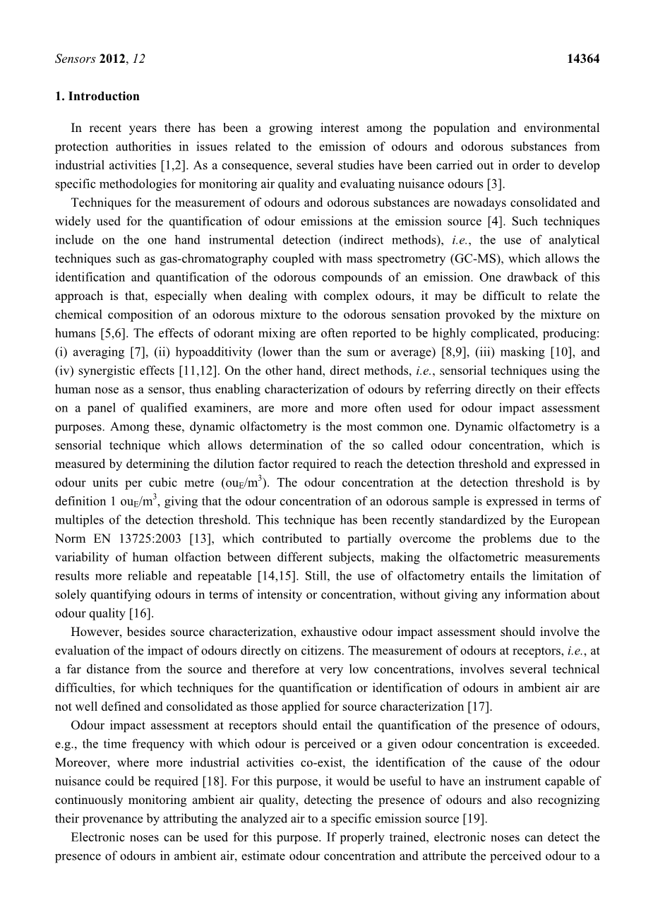 关于使用电子鼻监测环境空气中不同气味的研究的第一批研究之一是misselbrook等人进行的[24]。在他们的研究中,作者比较了两种不同装置的Odourmapper(由UMIST开发)和Aromascan(Aromascan plc,Crewe,UK)在气味定量中的可靠性。两种仪器对具有不同气味浓度的不同样品的传感器响应具有相同的趋势,但实验数据响应的差异不令人满意(分别为62%和59%)。Stuetz 等人发现气味浓度和传感器响应之间更好的相关性[6]。Micone和Guy [25]通过使用电子鼻来分析气味浓度为50至150欧E / m 3的气味样品,获得了良好的测试结果。然而,当气味浓度增加时,仪器准确性变差。