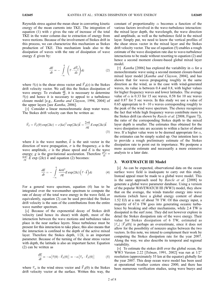 本文根据2007年WaveWatch III模型的结果,对全球海洋中的Stokes耗散进行了初