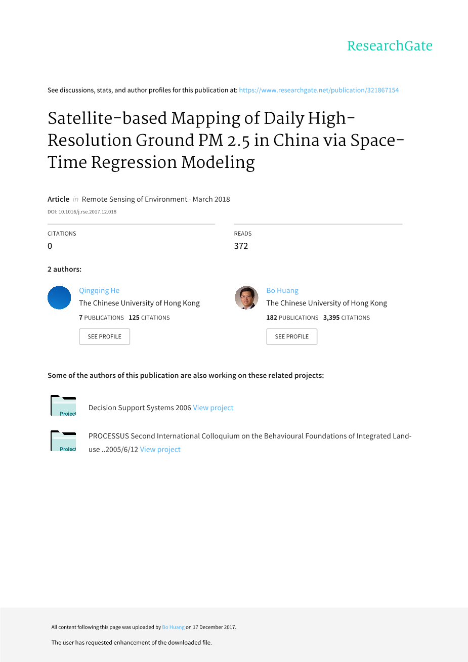 在2014年初,新的MODIS数据集6(C6)中有一个3km尺度的气溶胶产品。这是第一个具有较高空间分辨率的全球气溶胶数据集。精细的气溶胶梯度可以更好地应用于空气质量,即改进统计模型的性能并提供细颗粒物的空间变化细节。但是,MODIS的3kmAOD数据通过暗目标算法在黑暗表面反演AOD,这导致了逐天的AOD图像存在大量数值缺失,特别是多余具有复杂陆地表面的大面积区域。换句话说,仅使用MODIS 3kmAOD产品作为主要预测因子不可能生成逐天的PM2.5高分辨率图像。因此,改善3km MODIS AOD产品逐天的数据覆盖对于多种土地覆盖类型的大面积区域估算PM2.5必不可少。已有多种模型被创建阐明卫星产品AOD和近地面PM2.5浓度之间的定量联系,从简单的线性回归模型(Engel-Cox et al. 2004; Wang and Christopher 2003)到高级统计模型,例如多元线性回归模型(Kloog et al. 2011; Kloog et al. 2012),和空间加权回归模型。(Hu et al. 2013; Ma et al. 2014; Song et al. 2014; Zou et al. 2016).迄今为止,已有两种主要的时空回归方法被用在PM2.5-AOD关系的建立上。一个是逐天的GWR模型,它在单个天解决了PM2.5和AOD之间的空间变异并且取得了合理的结果但是,这个模型忽略了PM2.5-AOD关系可能随时间变化的事实,并且可能依赖于前几天的情况。因此逐天的GER模型不能利用数据中存在的时间自相关,也不能建立PM2.5-AOD样本少的天数的模型。