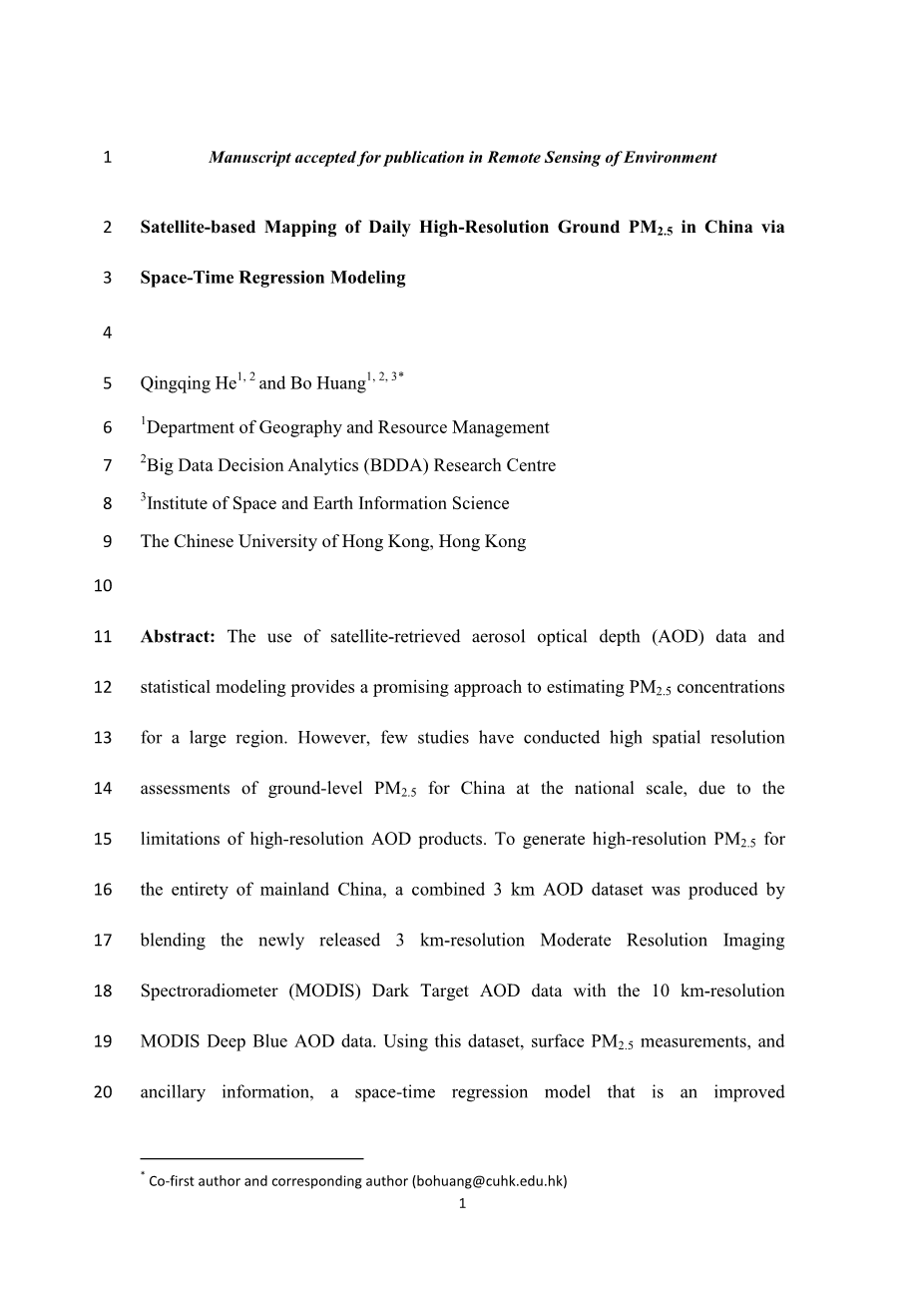 由于卫星遥感能够提供大尺度范围(甚至全球)的数据,因此卫星产品AOD信息是一个推断近地面PM2.5浓度的可替代的方法。(Engel-Cox et al. 2004; Wang and Christopher 2003). 为了更好的研究有关PM2.5的空气污染评估和流行病学的研究,需要高分辨率的卫星反演得到的PM2.5浓度。在本研究领域高分辨率的研究已经在北美利用大气校正多角度反演1km尺度的AOD日益开展。然而,由于缺乏高分辨率的卫星AOD产品,对中国的相关研究很少。在全国尺度上的研究仅做出PM2.5在10公里到50公里分辨率之间的PM2.5的变化,这些研究应用中等分辨率成像光谱仪(MODIS)二级产品10km的AOD产品以及多角度成像光谱仪(MISR)二级AOD产品。(Fang et al. 2016; Ma et al. 2014; Ma et al. 2016).