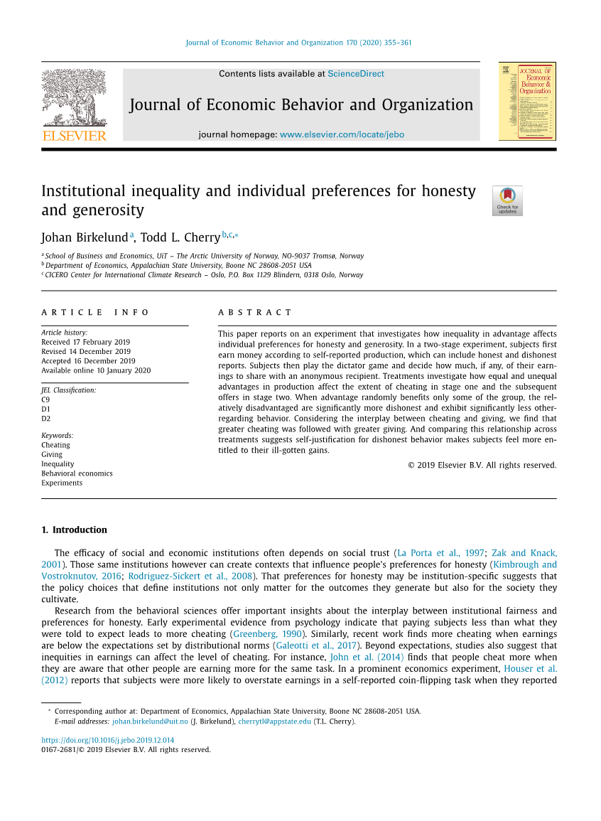 社会和经济机构的效能往往取决于社会信任(La Porta等人,1997年;Zak和Knack,2001)。然而,这些相同的制度可以创造出影响人们对诚实的偏好的环境Vostroknutov, 2016;Rodriguez-Sickert等,2008)。对诚实的偏好可能是机构特有的,这表明决定制度的政策选择不仅关系到制度产生的结果,也关系到社会风气的培养。行为科学的研究为制度公平和诚实偏好之间的相互作用提供了重要的见解。早期心理学实验证据表明,支付给受试者的报酬低于他们被告知的预期会导致更多的欺骗行为(Greenberg, 1990)。同样,最近的研究发现,当收入低于分配规范设定的预期时,欺诈行为会更多(Galeotti等人,2017年)。超出预期的是,研究还表明,收入的不平等也会影响作弊的程度。例如,John et al.(2014)发现,当人们意识到其他人做同样的工作赚得更多时,他们会更容易作弊。在一个著名的经济学实验中,Houser等人(2012)报告说,在自我报告的掷硬币任务中,当被试报告在之前一个不相关的独裁者游戏中受到不公平对待时,他们更有可能夸大收入。研究结果表明,个人对诚实的偏好受到程序公平和分配公平的影响(例如,Bolton等人,2005年;Frey等人,2004年;Greiner等.,2012)。因此,当不公平的过程产生不诚实的结果时,人们可能会为不诚实的行为辩护。如果是这样,作弊将取决于管理结果的机构的公平感。尽管不平等可能很重要,但如何影响不平等也很重要。