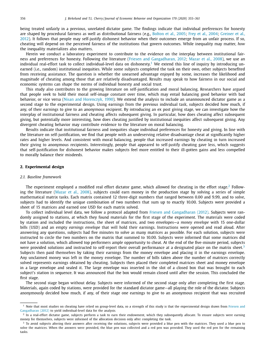 这项研究也有助于越来越多的关于自我辩护和道德平衡的文献。研究人员认为,随着时间的推移,人们寻求保持他们的道德自我形象不变,这可能需要平衡好行为和坏行为,反之亦然(Nisan和Horenczyk,1990)。我们将分析扩展到将一个未宣布的独裁者游戏作为实验设计的第二阶段。利用之前个人任务的收入,研究对象决定他们收入的多少(如果有的话)给匿名接受者。通过引入一个事后捐赠阶段,我们可以调查制度公平和欺骗的相互作用如何影响后来的捐赠。特别是,作弊如何影响以后的捐赠,但更有趣的是,作弊如何被制度上的不平等所证明,如何影响以后的捐赠。任何不同的作弊行为都可能为道德平衡的文献提供证据。