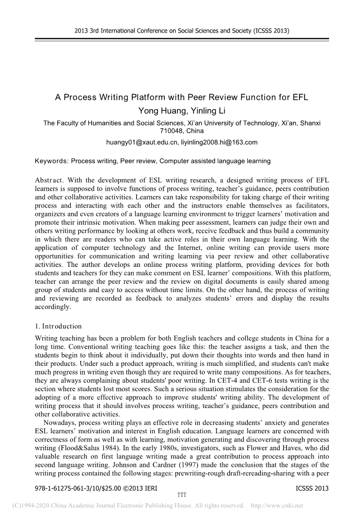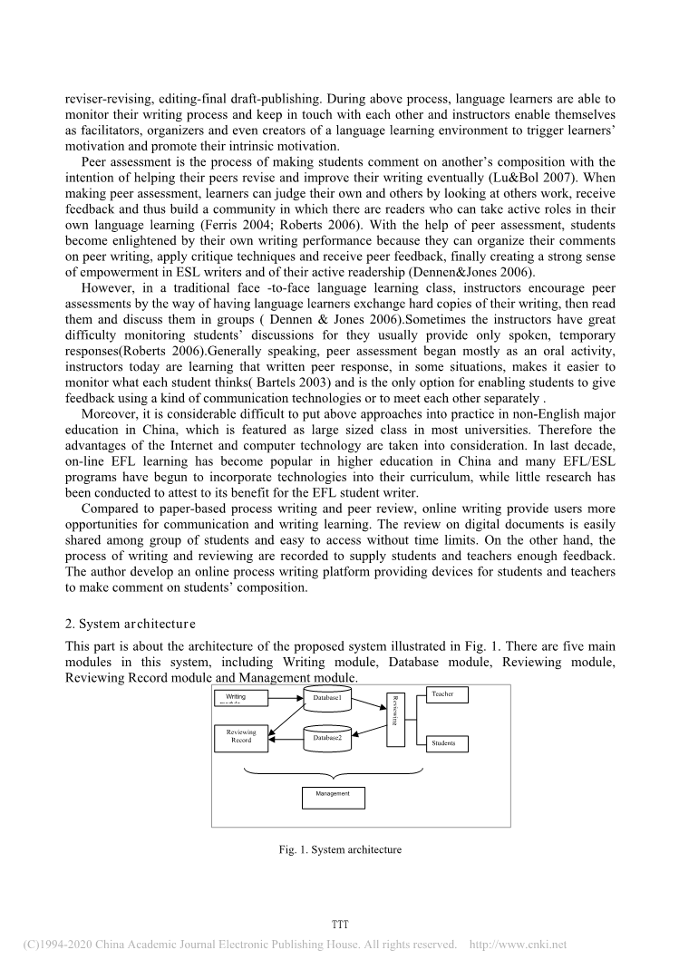 长期以来,写作教学一直是困扰我国英语教师和大学生的一个难题。传统的写作教学是这样的:教师布置一个任务,然后学生开始独立思考,把他们的想法用文字表达出来,然后交上他们的作品。在这样的成果教学法下,写作大大简化,学生即使要写很多作文,也不能在写作上取得很大进步。至于老师,他们总是抱怨学生的写作不好。在大学英语四、六级考试中,写作是学生失分最多的环节。在这种情况下采用这种方法可以有效地提高学生的写作能力。写作过程的发展应包括过程写作、教师指导、同伴贡献等协作活动。目前,过程写作在降低学生的焦虑、激发学生学习英语的动机和兴趣方面起到了有效的作用。语言学习者关注形式的正确性以及通过过程写作的学习、动机的产生和发现(Floodamp;amp;Salus 1984)。20世纪80年代初,Flower和Haves等对第一语言写作进行了有价值的研究,为第二语言写作过程研究做出了巨大贡献。Johnson和Cardner(1997)得出的结论是,写作过程的各个阶段包括以下几个阶段:预写草稿、重读与同伴分享修改,编辑定稿出版。在这一过程中,语言学习者能够监控自己的写作过程并保持联系,教师使自己成为语言学习环境的促进者、组织者甚至创造者,从而激发学习者的学习动机,促进他们的内在动机。同侪评鉴是让学生对他人的作文进行评语的过程,目的是帮助同龄人最终修改和提高他们的写作水平(Luamp;Bol 2007)。在进行同侪评估时,学习者可以通过观察他人的工作来判断自己和他人,接受反馈,从而建立一个社区,其中读者可以在自己的语言学习中发挥积极作用(Ferris 2004;Roberts 2006)。在同侪评鉴的帮助下,学生会被他们自己的写作表现所启发,因为他们可以组织他们对同侪写作的评论,运用批评技巧,并接受同侪的反馈,最终在ESL作家和他们的活跃读者中创造出一种强烈的授权感(Dennenamp;Jones 2006)。然而,在传统的面对面语言学习课堂上,教师通过让语言学习者交换他们写作的硬拷贝来鼓励同侪评估,然后阅读并分组讨论(Dennenamp;Jones 2006)。有时教师很难监督学生的讨论,因为他们通常只提供口头的、临时的回应(Roberts 2006)。一般来说,同侪评估最初主要是口头活动,现在的教师正在学习书面同伴反应,在某些情况下,可以更容易地监控每个学生的想法(Bartels 2003),并且是让学生使用某种通信技术提供反馈或单独见面的唯一选择。此外,在我国非英语专业教育中,由于大多数大学都是大班制的,因此在非英语专业的教学中实施上述教学方法是相当困难的。因此,互联网和计算机技术的优势被考虑在内。在过去的十年里,在线英语学习在中国的高等教育中越来越流行,许多EFL/ESL课程已经开始将技术融入课程中,而很少有研究证明它对学生写作有好处。与书面过程写作和同行评议相比,在线写作为用户提供了更多的交流和写作学习机会。对数字文档的评论很容易在学生群体中共享,并且不受时间限制,易于访问。另一方面,记录写作和复习的过程,为学生和教师提供足够的反馈。作者开发了一个在线过程写作平台,为学生和教师提供了对学生作文进行评论的设备。
