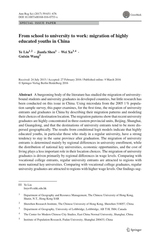 摘要:新兴的文献资料有很多研究发达国家大学毕业生的迁移,但在中国对此问题的研究很少。利用2005年1%人口抽样调查中的微观数据,本文首次通过描述他们的迁移模式和建立目的地选择模型,考察了中国大学入学者和毕业生的迁移情况。迁移模式显示,最近的大学毕业生高度集中在北京,上海和广东三个东部省份单位,大学入学者的目的地往往更加分散。根据有条件的 logit模型的结果表明,受过高等教育的年轻人,特别是那些在普通大学学习的年轻人,毕业后很有可能留在就读地的省份。大学入学者的迁移主要取决于大学入学率的地区差异,而国家重点大学的分布、经济发展和生活费用在其选址中起着不太重要的作用。大学毕业生的迁移主要是由于工资水平的地区差异。与职业大学入学者相比,普通大学入学者更易被吸引到拥有更多国家重点大学的地区;与高职毕业生相比,普通大学毕业生更易被吸引到工资水平较高的地区。研究表明可以通过投资高等教育以抑制中国欠发达地区的人才流失,提高劳动力市场收益率是一种更有效的方法。