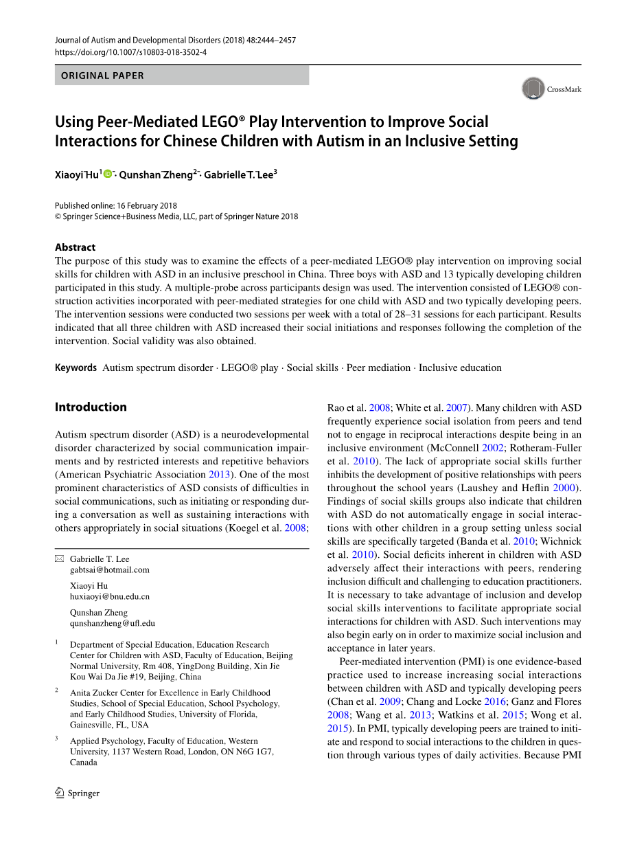 Using Peer-Mediated LEGOreg; Play Intervention to Improve Social Interactions for Chinese Children with Autism in an Inclusive Setting
