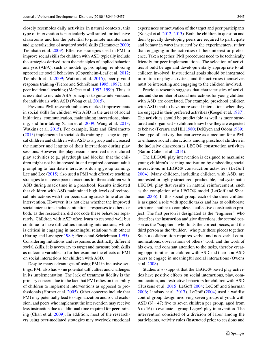 Peer-mediated intervention (PMI) is one evidence-based practice used to increase increasing social interactions between children with ASD and typically developing peers (Chan et al. 2009; Chang and Locke 2016; Ganz and Flores 2008; Wang et al. 2013; Watkins et al. 2015; Wong et al. 2015). In PMI, typically developing peers are trained to initi- ate and respond to social interactions to the children in ques- tion through various types of daily activities. Because PMI closely resembles daily activities in natural contexts, this type of intervention is particularly well suited for inclusive classrooms and has the potential to promote maintenance and generalization of acquired social skills (Hemmeter 2000; Trembath et al. 2009). Effective strategies used in PMI to improve social skills for children with ASD typically include the strategies derived from the principles of applied behavior analysis (ABA), such as modeling, prompting, reinforcing appropriate social behaviors (Oppenheim-Leaf et al. 2012; Trembath et al. 2009; Watkins et al. 2015), peer pivotal response training (Pierce and Schreibman 1995, 1997), and peer incidental teaching (McGee et al. 1992, 1999). Thus, it is essential to include ABA principles to guide interventions for individuals with ASD (Wong et al. 2015).