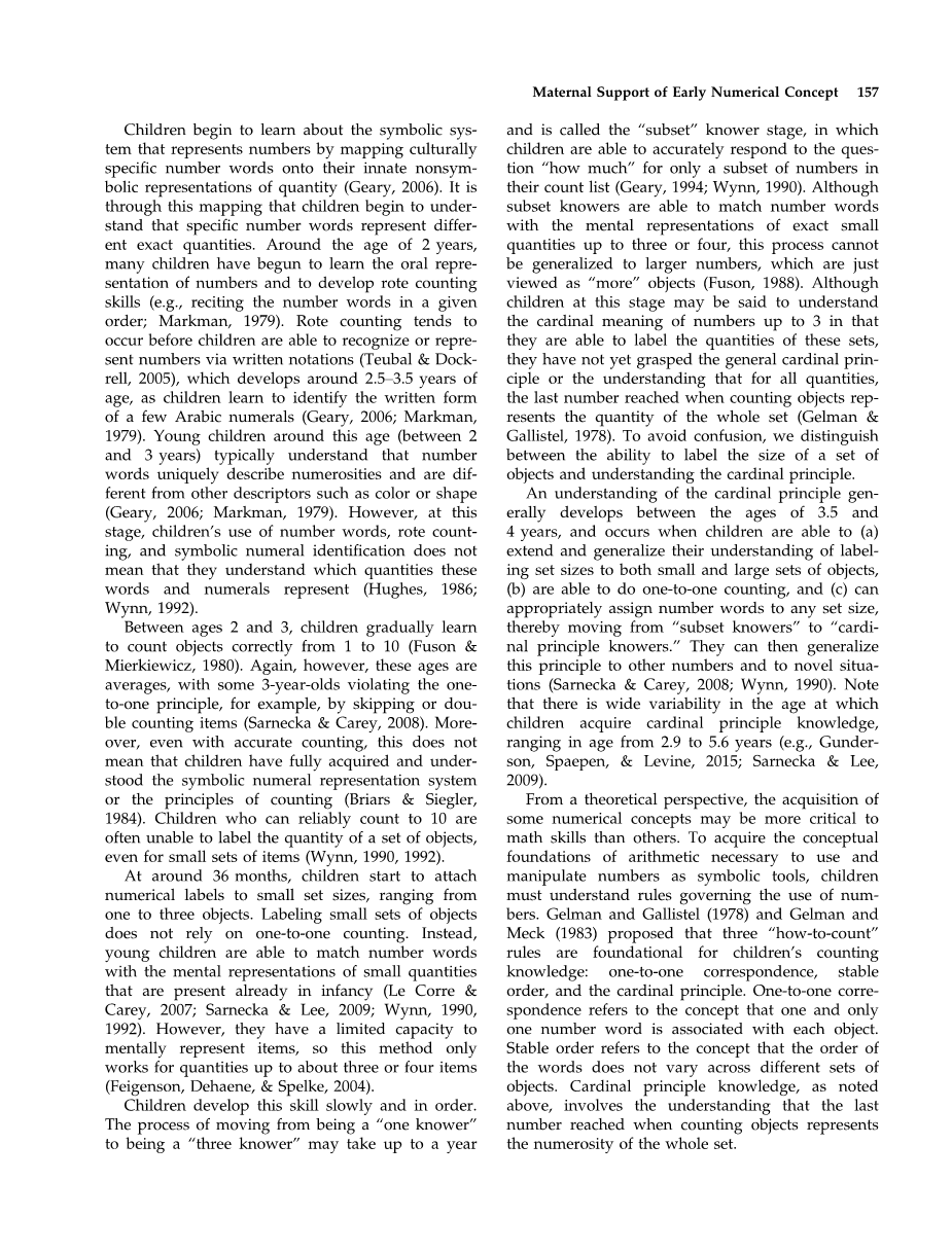 有许多关键的里程碑,对于儿童理解与精确数值相关的符号数值系统是必不可少的。在目前对36个月产妇数字支持的研究中,我们重点支持这个年龄前后发展起来的特定数字概念,包括死记硬背、识别书面数字、一对一的对象计数,以及为不同数量的对象组提供数字标签(例如,“这里有3个苹果。”)中。应该指出的是,儿童获得不同概念的年龄差异很大。
