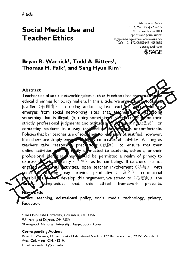 【关键字】伦理,教学,教育政策,社交媒体,技术,隐私,Facebook。
