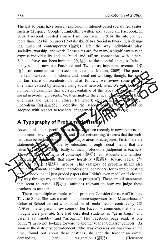【正文】这10年来,我们可以看到互联网上的社交媒体网站数量成爆炸式的增长,例如Google ,Twitter,除此之外还有Facebook。2004年它有一百万用户,2014年它声称拥有超过12.3亿用户。社交网络正在改变我们的生活——每个人玩的方式,社交的方式,崇拜的方式,工作的方式。对于许多人来说,这些网站是表达个性,建立和肯定与他人关系的重要方式。学校也同样产生了相应的社交变化。事实上,现在很多学校都把Facebook和Twitter作为重要的交流渠道(参见,例如,Melton,2009)。然而,在学校和社交网络的交叉路口,我们可以看到便利和事故并存。接下来,我们回顾一下教师使用社交网站造成的一些问题,看一些具有代表性的社交网络造成各类型问题的例子。然后,我们分析这些问题的伦理维度,并使用平等主义自由主义的伦理框架来描述在尊重教师参与社交网络方面学校应采取的政策。