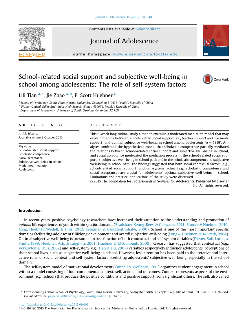 原文作者:Lili Tian , Jie Zhao , E. Scott Huebner