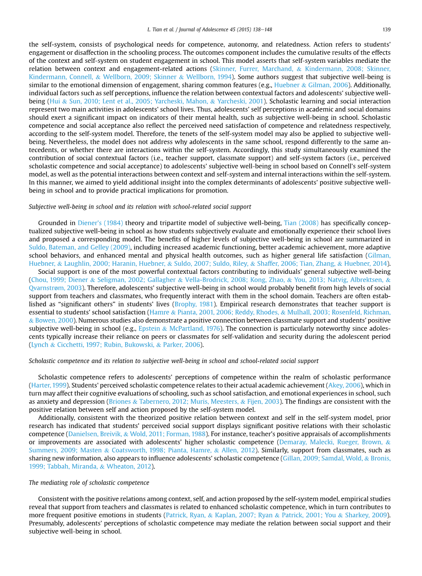 符合上下文之间的积极关系,自我,和行动提出的自我系统模型,实证研究表明,来自老师和同学的支持与增强学习能力,进而导致更频繁的在学生积极情绪(Patrick et al .,2007年,瑞恩和帕特里克,2001年,你和萨基,2009)。青少年对学习能力的认知可能会调节社会支持与他们在学校的主观幸福感之间的关系。