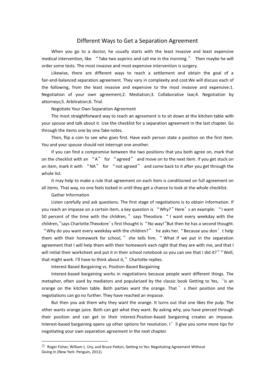 摘要:当你去看医生的时候,他通常是从最没有侵入性和最便宜的医疗干预开始的,比如“早上服用两片阿司匹林并打电话给我。”然后,他可能会进行一些测试。 最具侵入性和最昂贵的干预措施是手术。同样,达成以和解及公平为目的的分居协议也有不同的方式。 它们的复杂程度和成本各不相同。我们将从侵入性最小,成本最低;侵入性最大,成本最高这些方面讨论以下各项:1.自行协议签订分居协议;2.通过调解;3.通过合作法;4.通过律师进行协商;5.通过仲裁方式解决;6.通过诉讼方式解决。
