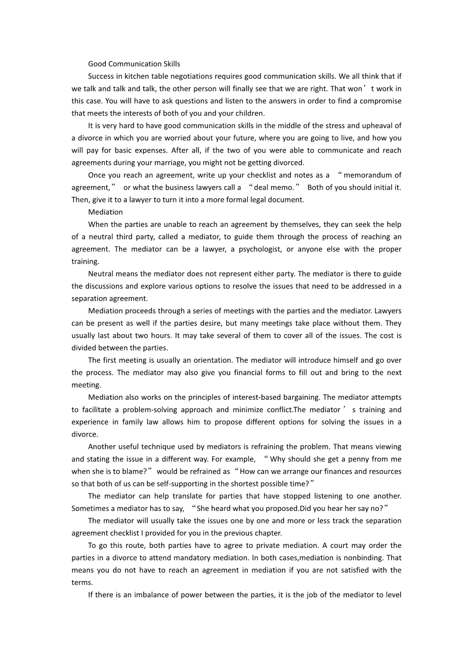 当当事人之间无法达成一致的协议时,他们可以寻求中立的第三方进行帮助,即调解人,以引导他们完成达成协议的过程。调解人可以是律师、心理学家或任何其他受过适当训练的人。中立意味着调解人不代表任何一方。调解人的作用是指导讨论和探索各种选择以解决在夫妻双方在分居协议中需要解决的问题。调解通过与当事人和调解人的一系列会议进行。如果当事人愿意,律师也可以出席,但许多会议并没有他们的出席。他们通常持续大约两个小时。可能需要他们中的几个来总结所有的问题,并且最终费用由双方分担。第一次会议通常是一个方式。调解人将介绍他自己,并完成这个过程。调解人也可以给你财务表格填写并通知你带来参加下一次会议。