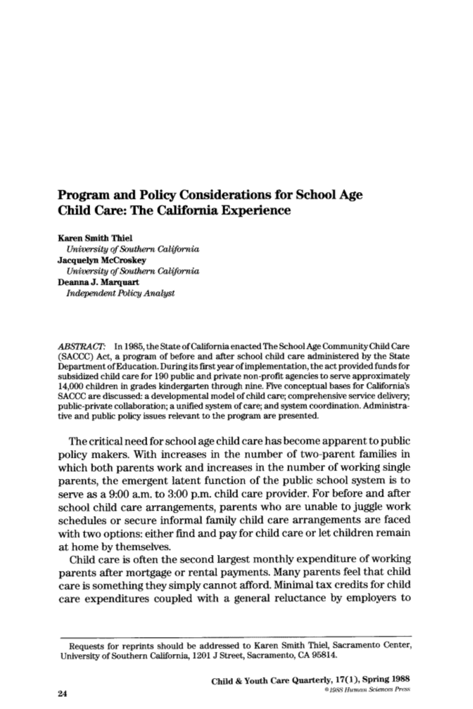 1983年,加利福尼亚州开始探索资助学龄儿童保育的可能性。一份名为“谁在看我们的孩子?闩锁现象”(参议院研究办公室,1983年)的报告借鉴了国家统计数据,记录了加州对学龄儿童保育的需求。 该报告估计,年龄在5至13岁之间的60万至80万名儿童经常无人监督或由兄弟姐妹或其他未成年子女照顾。同年,对来自洛杉矶市中心五个工作场所的近5000名员工进行的一项研究报告显示,21%的7至10岁儿童家庭和77%的10至13岁儿童家庭经常在放学后将孩子留下无人看管的情况( United Way,1983)。一项后续研究(United Way,1986)发现洛杉矶县只有五分之一的在职母亲的孩子接受了有执照或无执照的托儿服务。 问题的严重性需要通过政府,学校,社会服务机构和家长的共同努力,在全州范围内进行全面的努力,以刺激学龄儿童的供应。