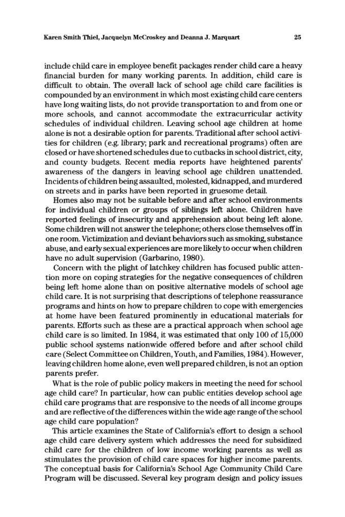 对于公共决策者来说,学龄儿童保育的迫切需要已经显而易见。随着父母双方工作的双亲家庭数量的增加以及单亲父母工作人数的增加,公立学校系统的紧急潜在功能是作为上午9:00至下午3:00的托儿所供应商。对于学前和学后的托儿安排,无法兼顾工作时间表或确保非正式的家庭托儿安排的父母面临两种选择:找到和支付托儿服务或让孩子独自留在家中。
