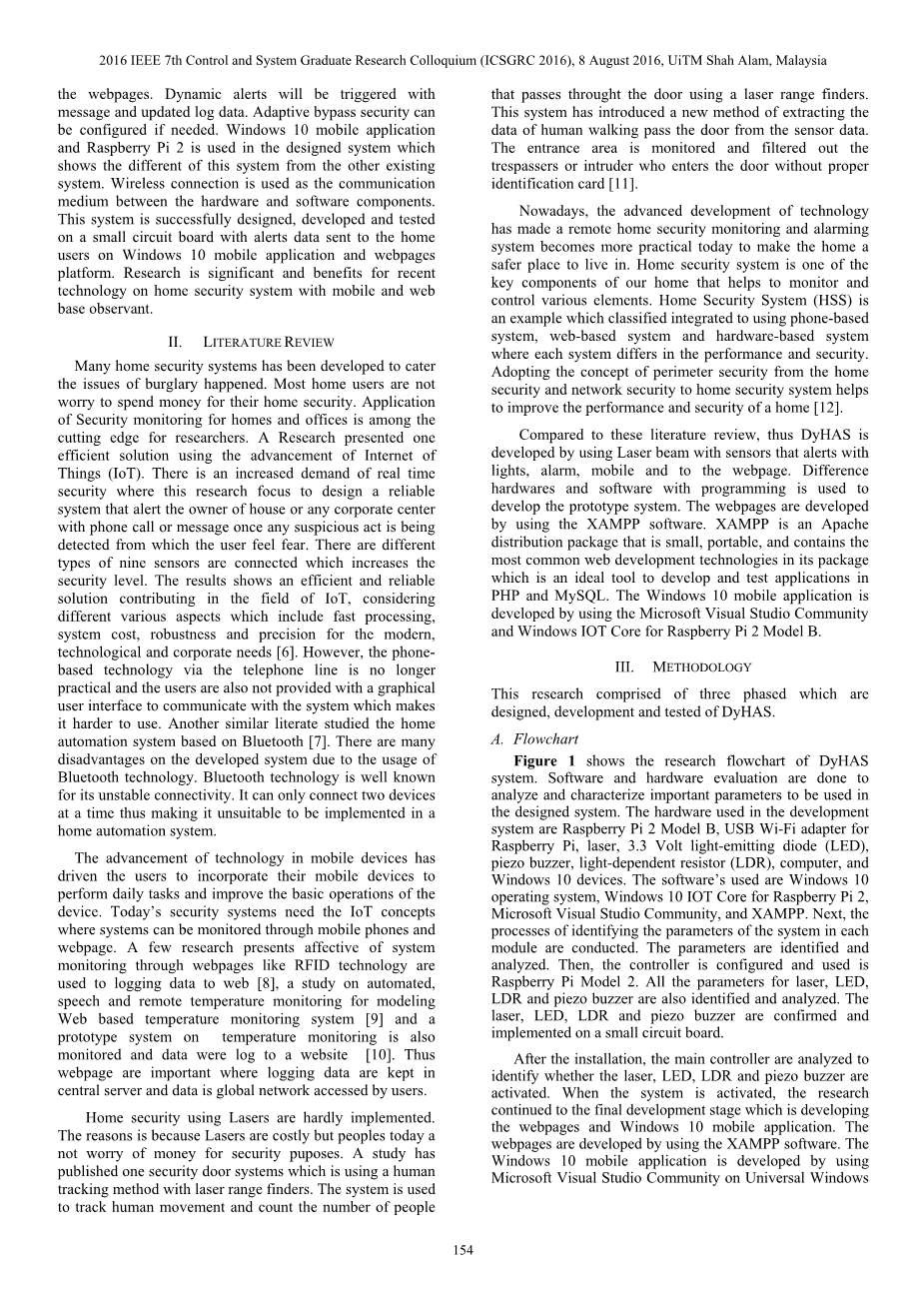 与这些文献综述相比,DyHAS是利用激光束与传感器结合开发的,传感器可以通过灯光、报警、移动和网页发出警报。采用不同的硬件和软件,通过编程实现了原型系统的开发。网页是用XAMPP软件开发的。XAMPP是一个小型的、可移植的Apache发行包,它包含最常见的web开发技术,是用PHP和MySQL开发和测试应用程序的理想工具。Windows 10移动应用程序是使用Microsoft Visual Studio社区和Windows IOT Core为Raspberry Pi 2 Model B开发的。