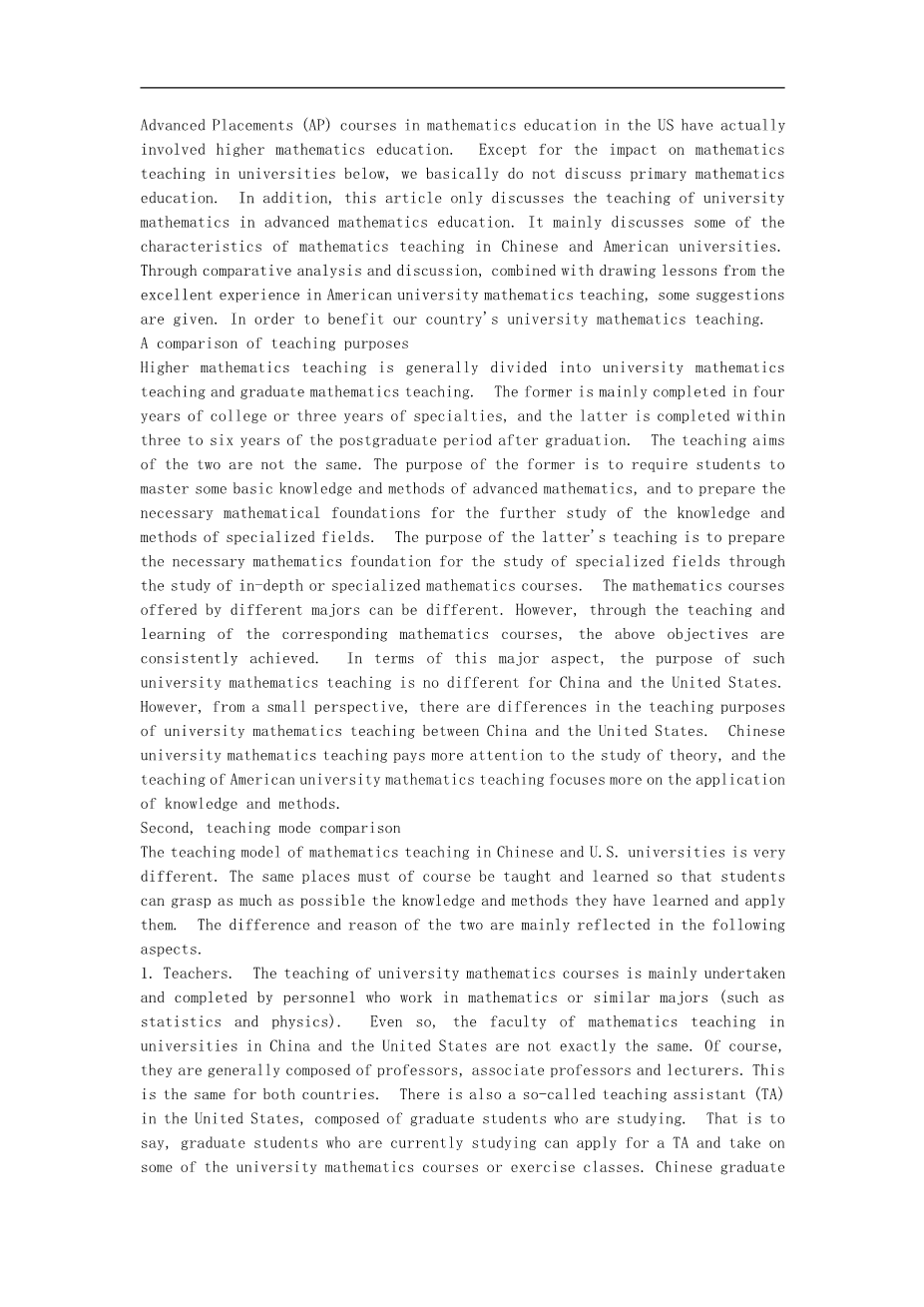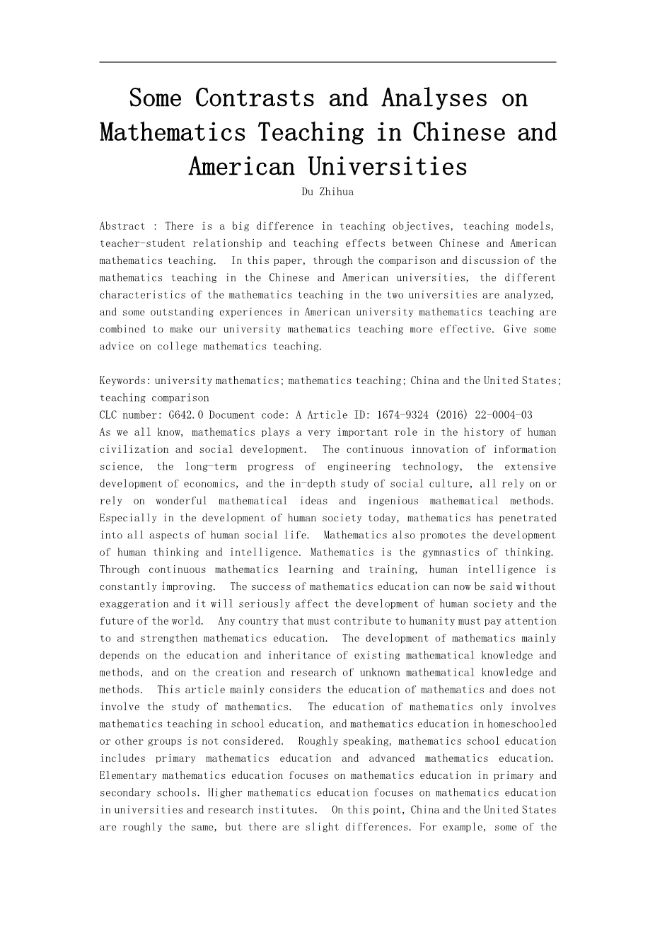 众所周知,数学在人类文明和社会发展的历史中起着非常重要的作用。信息科学的不断革新,工程技术的长久进步,经济学说的广泛发展,社会文化的深入研究等等,无不依赖于或借助于种种美妙数学思想和精巧的数学方法。特别是人类社会发展到今天,数学已经渗透到人类社会生活的方方面面。数学还对人类的思维和智力发展起了推动作用,数学是思维的体操。通过不断的数学学习和训练,人类的智力水平在不断地提升。数学教育的成功,现在可以毫不夸张地说,会严重影响到人类社会的发展和世界的未来。任何一个国家要为人类做出贡献必须得重视和加强数学教育。数学的发展主要依赖于对已存在的数学知识和方法的教育、传承和对未知数学知识和方法的创造和研究。本文主要考虑数学的教育方面,不涉及数学的研究方面。数学的教育方面仅涉及学校教育的数学教学方面,至于数学的家庭(home-schooled)或其他团体的数学教育不在考虑之列。粗略地讲,数学的学校教育分初等数学教育和高等数学教育,初等数学教育主要集中于小学和中学的数学教育,高等数学教育集中于大学及研究院的数学教育。关于这一点,中美大致相同,但略有差别,譬如美国中学数学教育中的一些AP课程(Advanced Placements,俗称大学先修课程)实际上已经涉及到高等数学教育的内容。除了下文中涉及到对大学数学教学的影响外,我们基本不讨论初等数学教育。此外,本文也仅仅讨论高等数学教育的大学数学的教学部分,主要讨论中美大学数学教学各自的一些特点;通过对比分析和讨论,结合借鉴美国大学数学教学中的优秀的经验,给出一些建议,以期对我国的大学数学教学有所裨益。