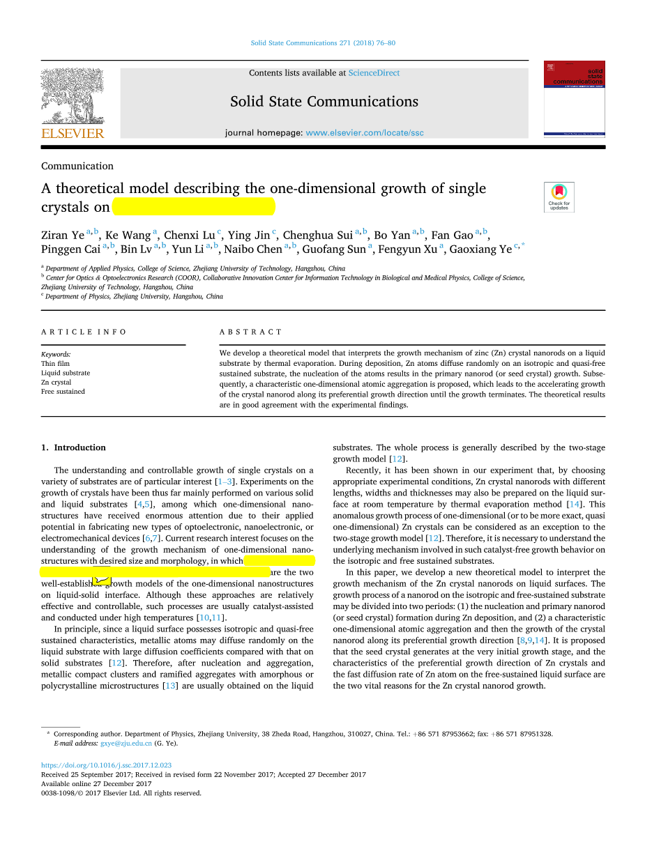 在这篇文章中,我们提出了一个新的理论去解释在Zn晶体纳米棒在液相基底表面的生长机理。一个纳米棒在各项同性和近自由支撑的基底上的生长机理可以分为两个时期:(1)在Zn沉积期间,会出现成核现象和形成初级的纳米棒(种子晶体);(2)形成一个具有一维特征的原子凝聚体,然后晶体纳米棒会沿着其优先生长方向生长。有人提议种子晶体在最初的生长阶段产生,Zn晶体优先生长方向的特征和Zn原子在各向同性、近自由支撑的液体表面高扩散速率是引起Zn纳米晶体棒生长的两个重要的原因。