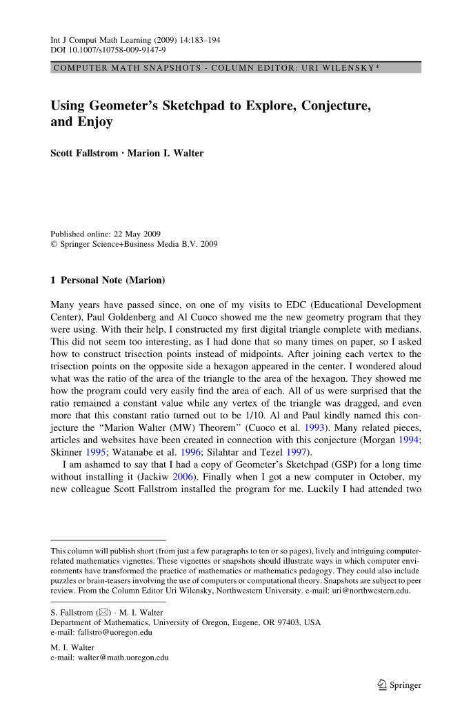 摘要:许多年过去了,在我访问EDC(教育发展中心)的时候,Paul Goldenberg和Al Cuoco给我看了他们正在使用的新几何程序. 在他们的帮助下,我用中位数构造了我的第一个数字三角形. 这似乎并没有太有趣,因为我在纸上做了这么多次,所以我问如何构造三等分点而不是中点. 在将每个顶点连接到相对侧的三等分点之后,六边形出现在中心. 我想知道三角形面积和六边形面积的比值是多少. 他们向我展示了这个程序是如何很容易地找到每一个区域的. 我们都很惊讶,这个比率保持恒定值,而三角形的任何顶点都被拖动了,而且这个常数比原来是1/10. AL和保罗亲切地把这个猜想命名为“Marion Walter(MW)定理”(Cuoco et al. 1993). 许多已经创建的相关的文章和网站与此猜想有关(Morgan 1994; Skinner 1995; Watanabe等. 1996; Silahtar和Tezel 1997).