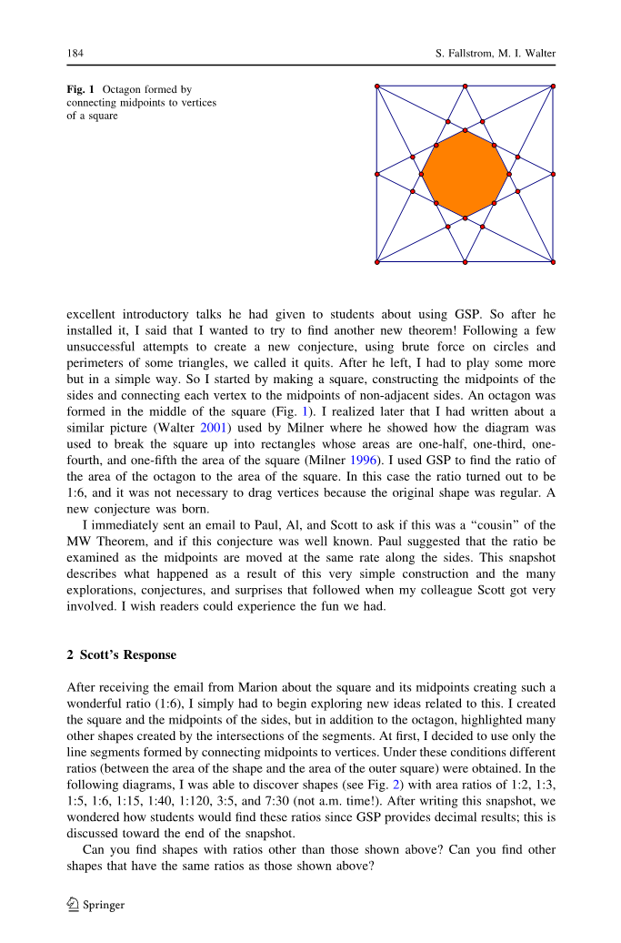 我很惭愧地说,我有一个Geometer画板(GSP)的副本很长一段时间没有安装它(JAKIW 2006). 最后,当我在十月得到一台新电脑时,我的新同事Scott Fallstrom为我安装了这个程序. 幸运的是,我参加了两次他对学生使用GSP的精彩介绍. 所以在他安装它之后,我说我想尝试另一个新的定理!在一些不成功的尝试,创造一个新猜想,使用蛮力在圆圈和周界的一些三角形,我们称之为放弃. 他离开后,我不得不再玩一些,但是很简单. 于是,我开始做一个正方形,构造两边的中点,并把每个顶点连接到不相邻的边的中点. 在正方形的中间形成八边形(图1). 后来我意识到,我已经写了一张类似的图片(沃尔特2001),米尔纳在这里展示了如何使用图表来把正方形分解成矩形,这些区域的面积是二分之一,三分之一, Onfulthh,和一平方英尺的面积(米尔纳1996). 我用GSP来计算八边形面积与正方形面积的比值. 在这种情况下,比率原来是1:6,并且不需要拖曳顶点,因为原来的形状是规则的. 一个新猜想诞生了. 我立即给保罗、Al和史葛发了一封电子邮件,询问这是MW定理的“表兄弟”,如果这个猜想是众所周知的. 保罗建议,当中间点沿两侧移动的速率相同时,检查比率. 这个快照描述了这个非常简单的结构的结果,以及我的同事史葛非常关注的许多探索、猜想和惊奇. 我希望读者能体验到我们的乐趣.