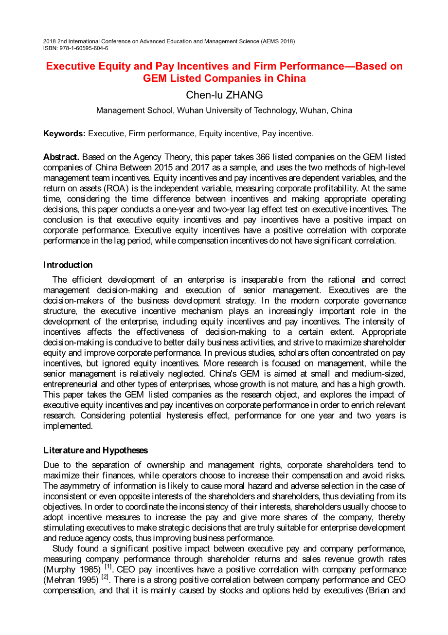 摘要:基于代理理论,本文以2015年至2017年中国366家创业板上市公司为样本,采用两种高层管理团队激励方法、股权激励和薪酬激励为因变量,资产回报率(ROA) 是衡量企业盈利能力的自变量。同时,考虑到激励措施与制定适当的经营决策之间的时间差,本文对高管激励措施进行了-年和两年的滞后效应检验。结论是,高管股权激励和薪酬激励对公司绩效产生积极影响,高管股权激励与滞后时期的公司绩效呈正相关。而薪酬激励则没有显着的相关性。