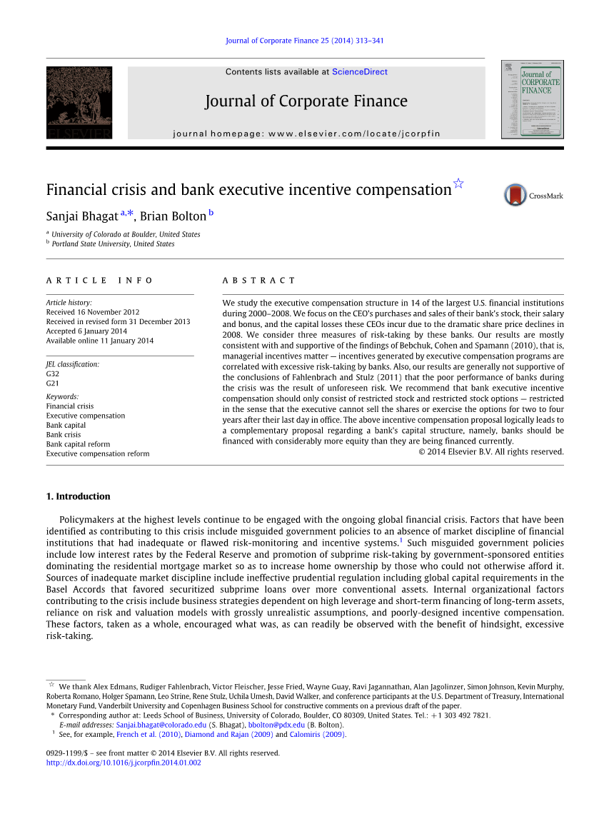 Fahlenbrach和Stulz (2011) 重点关注金融机构的首席执行官因其在其公司股票和股票期权中的所有权价值在危机期间下降而遭受的巨大损失,并得出结论:'不能将银行CEO的激励措施归咎于信贷危机或银行在危机期间的表现。他们认为,银行首席执行官和高级管理人员不能也不能预见银行的一些投资和交易战略的极端高风险性质。这些银行在危机期间表现不佳的原因是,它们对投资和贸易战略的高风险性质认识极不力。我们把这称为意外风险假说:银行高管正忠实地为其长期股东的利益而工作;银行在危机期间表现不佳是银行投资和贸易战略意外风险的结果。