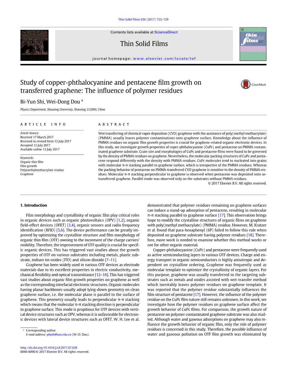 转移石墨烯中铜-酞菁和戊烯薄膜生长的研究:聚合物残留的影响