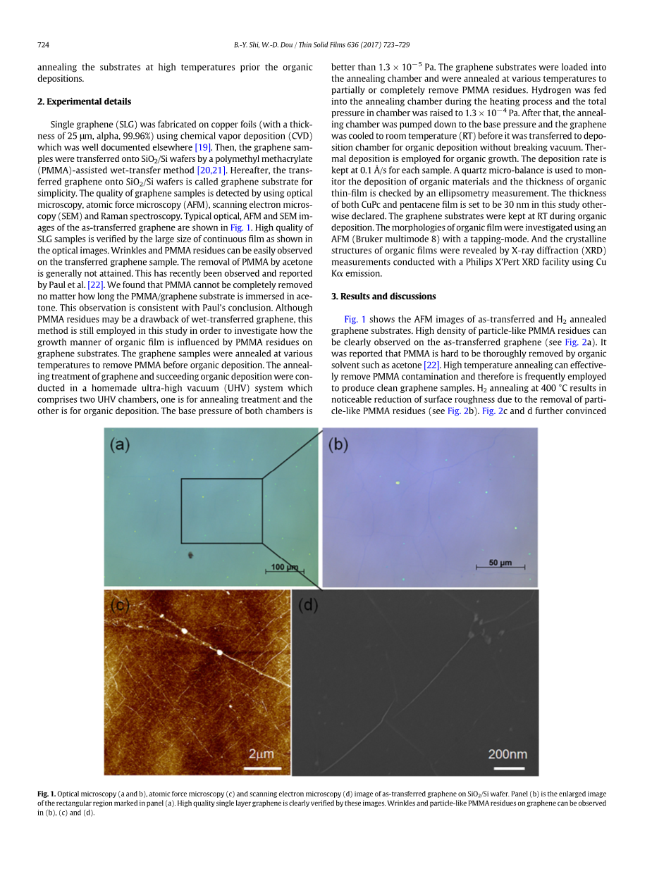 单石墨烯(SLG)捏造对铜薄片(厚度为25mu;m,alpha;,99.96%)使用化学气相沉积(CVD)这是有据可查的[19]。然后,将石墨烯样品通过聚甲基丙烯酸甲酯(PMMA)-辅助湿传递法转移到SiO2 / Si晶片上[20,21]。此后,将石墨烯转移到SiO2 / Si晶片上的方法称为石墨烯基板,为简单起见。利用光学显微镜、原子力显微镜、扫描电镜和拉曼光谱法检测石墨烯样品的质量。图1所示为传输的石墨烯的典型光学、AFM和SEM图像。高质量的SLG试样通过光学图像显示的连续膜的大尺寸进行验证。在转移的石墨烯样品上可以很容易地观察到褶皱和PMMA残留物。丙酮去除PMMA通常是没有达到的。Paul等[22]最近观察并报道了这一现象。我们发现无论PMMA /石墨烯浸没在丙酮中,PMMA都不能完全消除。这一观察结果与保罗的结论是一致的。虽然PMMA残留物可能是湿传递石墨烯的一个缺陷,但该方法仍在本研究中应用,以研究有机薄膜的生长方式是如何受到石墨烯基板上的PMMA残留物影响的。石墨烯样品在不同温度下退火,以去除有机沉积之前的PMMA。石墨烯的退火处理和后续的有机沉积是在自制的超高真空(UHV)系统中进行的,该系统由两个UHV腔室组成,一个是退火处理,另一个是用于有机沉积。参众两院的基础压比1.3times;10minus;5 Pa。石墨烯基板被加载到退火室中,在不同温度下退火,以部分或完全去除PMMA残留。氢在加热过程中被送入退火室室和总压强是上调为1.3times;10minus;4 Pa。在此之后,退火室被泵入基部压力,石墨烯冷却至室温(RT),然后将其转移到沉积室进行有机沉积,而不破坏真空。热沉积作用于有机生长。每个样品的沉积速率保持在0.1 A / s。采用石英微天平对有机材料的沉积进行监测,用椭圆测量法对有机薄膜厚度进行检测。在本研究中,CuPc和并五苯薄膜的厚度设定为30nm。在有机沉积过程中,石墨烯基板保留在RT中。用一种带模式的AFM(Bruker multimode 8)对有机膜的形貌进行了研究。和有机薄膜的晶体结构进行了X射线衍射(XRD)测量与飞利浦X Pert XRD设施使用铜Kalpha;发射。