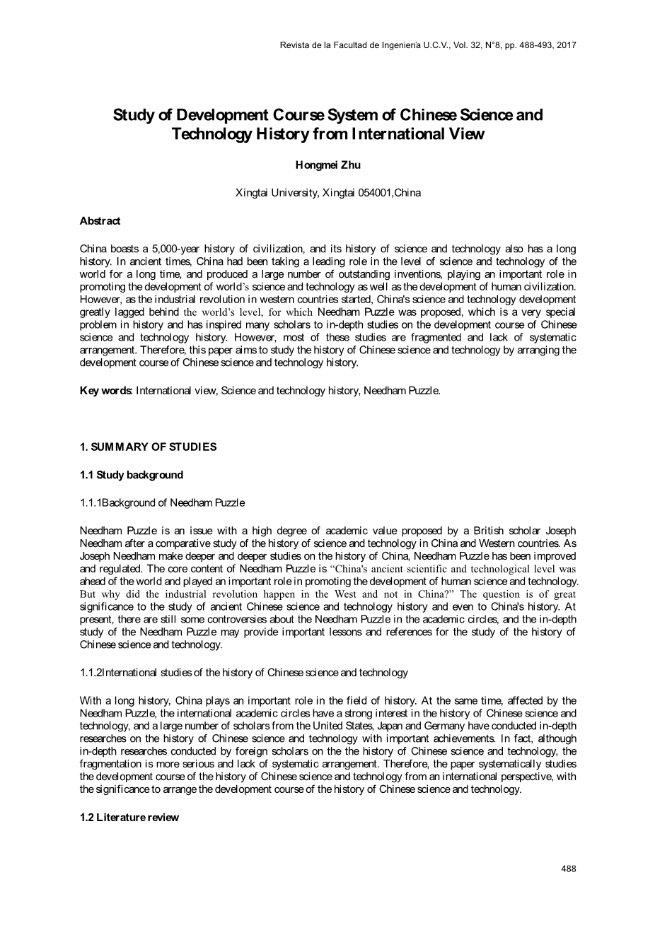 摘要:中国拥有五千年的文明史,其科技史也有悠久的历史。在古代,中国长期以来一直在世界科技水平方面发挥主导作用,产生了一大批优秀发明,随着人类文明的发展,对促进世界科技发展起到了重要作用。然而,随着西方国家工业革命的兴起,中国的科学技术发展大大落后于世界水平,为此提出了李约瑟难题,这是历史上一个非常特殊的问题,激励了许多学者深入研中国科技史的发展历程。但是,这些研究大部分是分散的,缺乏系统的安排。 因此,本文旨在通过安排中国科技史的发展历程来研究中国科技史。