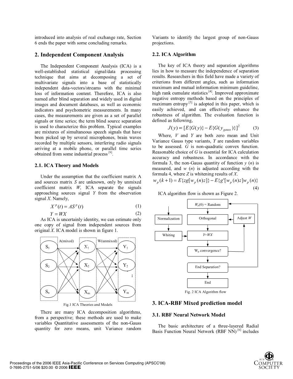 本文剩余部分的概述如下:第二节阐述了ICA的原理,模型和算法。第三节研究混合预测模型,第四节通过比较主成分分析(PCA)独立分量分析(ICA)作为预处理工具的特点,证明了基于独立分量分析的预测,第五节将ICA-RBF混合预测系统引入实际汇率分析,第六节以结束语结束本文。