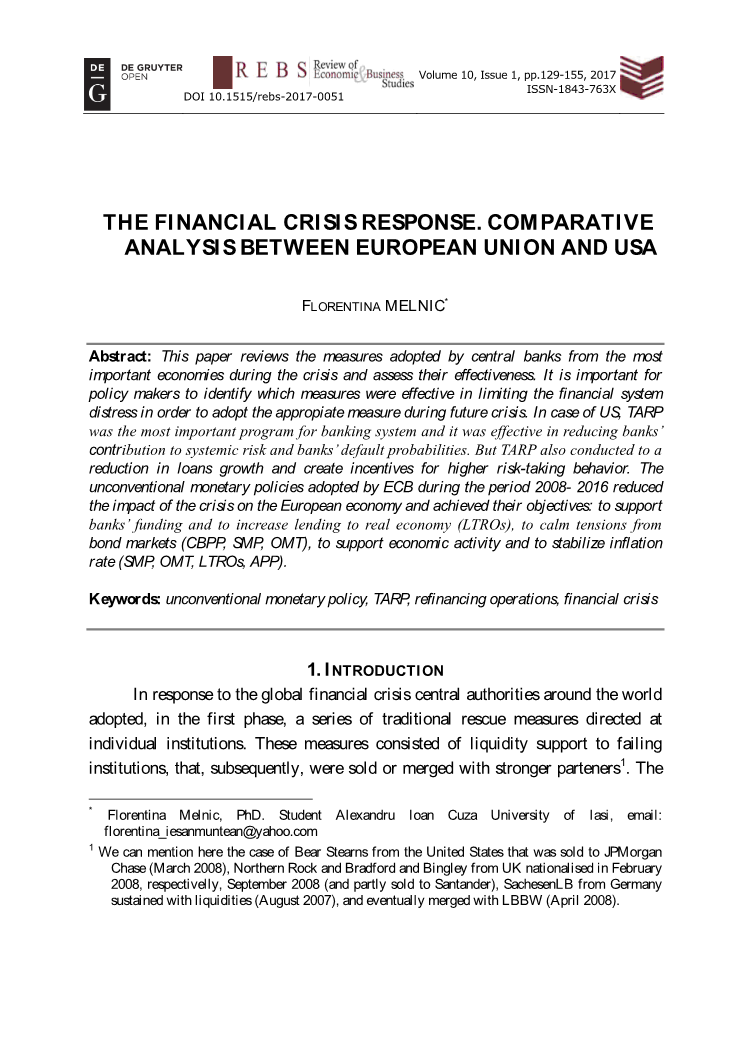 [2] 外文原文所在书名或论文题目:THE FINANCIAL CRISIS RESPONSE. COMPARATIVE ANALYSIS BETWEEN EUROPEAN UNION AND USA