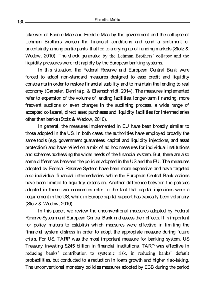 为应对全球金融危机,世界各国中央政府采取了一系列非标准措施,旨在缓解信贷和流动性限制,以恢复金融稳定和维持对实体经济的放贷。正如Farruggio、迈克拉克、乌德(2013)所证实的,TARP有着光明和黑暗的一面。轻边是指对金融体系产生的积极影响——降低了银行对系统风险的贡献,降低了短期违约概率,提高了股东价值。相比之下,有研究证明计划低效降低了银行的贷款增长,增加了银行的风险。然而,TARP帮助停止了金融恐慌的蔓延,恢复了投资者的信心。欧洲央行的政策实现了支持银行继续向实体经济放贷的首要目标。通过文献回顾,我们可以得出结论,银行增加了对家庭和非金融企业的供给,但是对经济的影响有限。然而,所采取的措施成功地缓解了初级市场和次级市场的紧张局势。如果我们回顾一下美国和欧洲央行的接触,我们可以看到,在金融危机开始时,各国中央政府的行为大致相似。两个重要国家的回应是降低利率,并采取一些非常规的货币政策——延长现有金融机构的到期日,降低适用于银行的合格抵押品标准,并开设一系列互换金融机构。如果我们谈到中央当局的做法之间的差异,我们必须考虑到美国经济是以市场为基础的,而欧洲央行的经济是以银行为基础的。这些分歧在雷曼兄弟倒闭以及欧洲主权债务危机的表现之后得以弥合。联邦储备系统采取的措施更具有扩张性,也针对个别金融中介机构,而欧洲央行的行动仅限于扩大流动性。这两个经济体采取的政策之间的另一个区别在于,在美国,资本注入是必需的,而在欧洲,资本支持通常是自愿的。