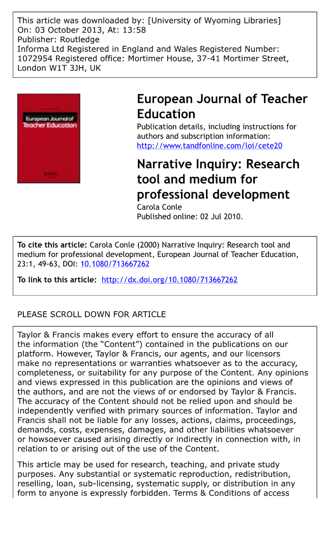 叙事研究的发展聚焦于一种特殊的制度环境中。以下简要描述了教育叙事探究是如何从研究工具转变为课程工具的,首先是在研究生阶段,然后是在教师发展的职前阶段。在参考了叙事调查的一些理论资源后,对1982年以来制定的标准和术语进行了审查,并探讨了调查中隐含的潜在危险以及使其保持理性的必要性。