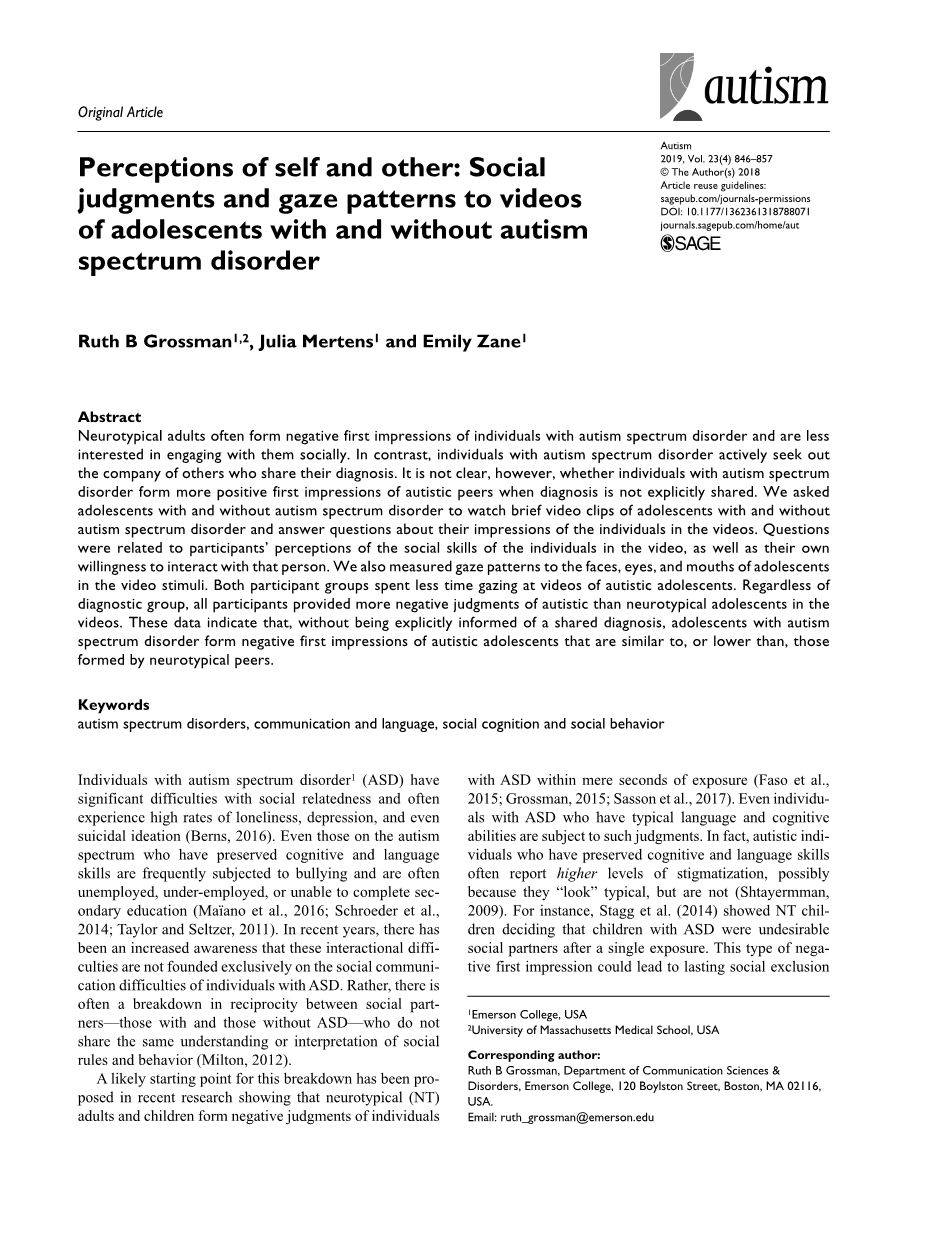 在最近的研究中已经提出了这种崩溃的可能起点,最近的研究表明,神经型(NT)成人和儿童在接触ASD的几秒钟内就对ASD患者形成负面判断(Faso等人,2015;Grossmin, 2015; Sasson 等人,2017) 。即使患有自闭症的人具有典型的语言和认知能力,也会受到这种判断的影响。实际上,保留了认知和语言技能的自闭症个体经常会受到较高程度的污名化,这可能是因为他们“看起来”很典型,但事实并非如此(Shtayerman,2009)。例如,Stagg等人(2014)显示NT儿童在一次接触后认为患有自闭症的儿童是不受欢迎的社会伙伴。这种负面的第一印象可能会导致持久的社会排斥。