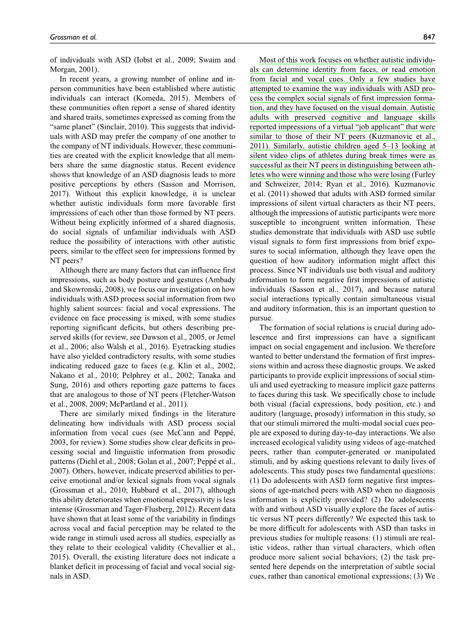 尽管影响第一印象的因素有很多,比如身体姿势和手势(Ambady和Skowronski, 2008), 我们的研究重点是ASD患者如何处理来自两个显著来源的社会信息:面部表情和声音表情。关于面部处理的证据是复杂的,一些研究报告有显著的缺陷,但其他研究描述了保留的技能(回顾,见Dawson et al,2005, 或Jemel et al,2006; Walsh等人,2016)。 眼球追踪研究也得出了相互矛盾的结果,一 些研究表明,人们对面孔的注视减少(如KIin等,2002;中野等,2010: Pelphrey等,2002; Tanaka and Sung, 2016) 其他人的面孔报告凝视模式与NT同龄人相似。(Fletcher-Watson et al,2008, 2009; McP artland等,2011)。
