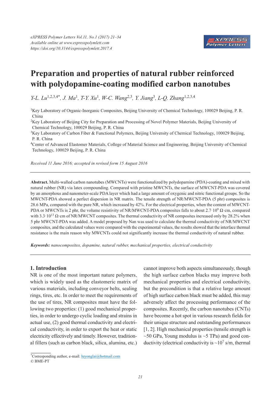 摘要: 被聚多巴胺(PDA)涂层官能化的多壁碳纳米管(MWCNTs)和天然橡胶(NR)通过乳液共混而混合。与原始的碳纳米管相比,聚多巴胺-多壁碳纳米管(MWCNTs-PDA)表面覆盖着有大量的氧和氮官能团的非晶的纳米尺度的PDA层。所以聚多巴胺-多壁碳纳米管在橡胶基体中显示出一种完美的分散。天然橡胶/聚多巴胺-多壁碳纳米管(NR/MWCNTs-PDA)(5份)复合材料的抗张强度是28.6 MPa,与纯天然橡胶相比,增加了42%。至于电学性能,当聚多巴胺-多壁碳纳米管或多壁碳纳米管含量为2份时,天然橡胶/聚多巴胺-多壁碳纳米管复合材料的体积电阻率相比天然橡胶 /多壁碳纳米管复合材料的体积电阻率3.3·1013Omega;·cm下降到约2.7·109Omega;·cm。当5份聚多巴胺-多壁碳纳米管加入后,天然橡胶复合材料的热导率仅增加了28.2%。Nan提出了一个用于计算天然橡胶/碳纳米管复合材料的热导率的模型,其计算值与实验值进行比较,结果表明,界面热阻是多壁碳纳米管不能显著提高天然橡胶的导热系数的主要原因。