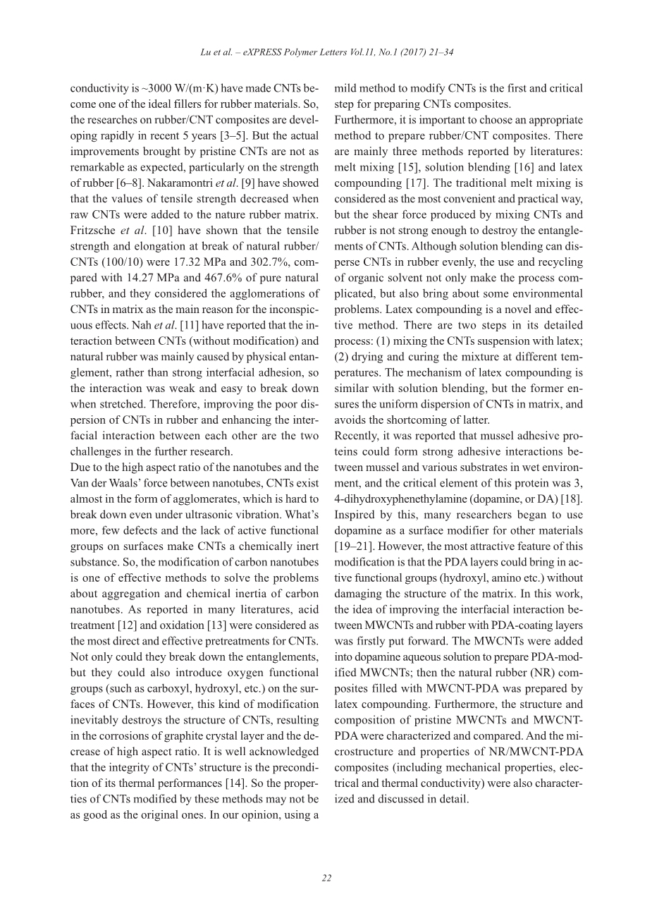 近日,据报道,潮湿环境下在贻贝和各种基材蚌之间,贻贝粘蛋白可以形成很强的粘合作用,这种蛋白质的关键元素是3,4-二羟基苯乙胺(多巴胺,或DA)[ 18 ]。受此启发,许多研究者开始使用多巴胺作为其他材料的一种表面改性剂 [ 19-21 ]。然而,这种改性最有吸引力的特点是聚多巴胺层可以带来积极的官能团(羟基,氨基等),而不损害矩阵的结构。在这项工作中,首先提出了改善有PDA涂层的多壁碳纳米管和橡胶之间的界面相互作用的想法。多壁碳纳米管加入多巴胺溶液来制备聚多巴胺改性的多壁碳纳米管;那么填充聚多巴胺-多壁碳纳米管的天然橡胶(NR)采用乳液共混法制备。此外,原始碳纳米管和聚多巴胺改性的多壁碳纳米管的结构和组成是具有特征的和可比较的。天然橡胶/ 聚多巴胺改性的多壁碳纳米管复合材料的微观结构和性能(包括力学性能、导电性和导热性)进行了表征,并进行了详细的讨论。