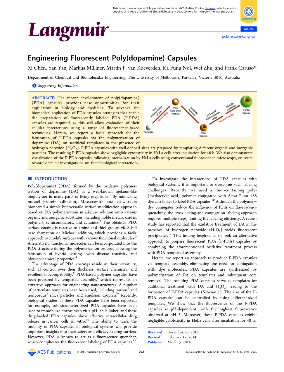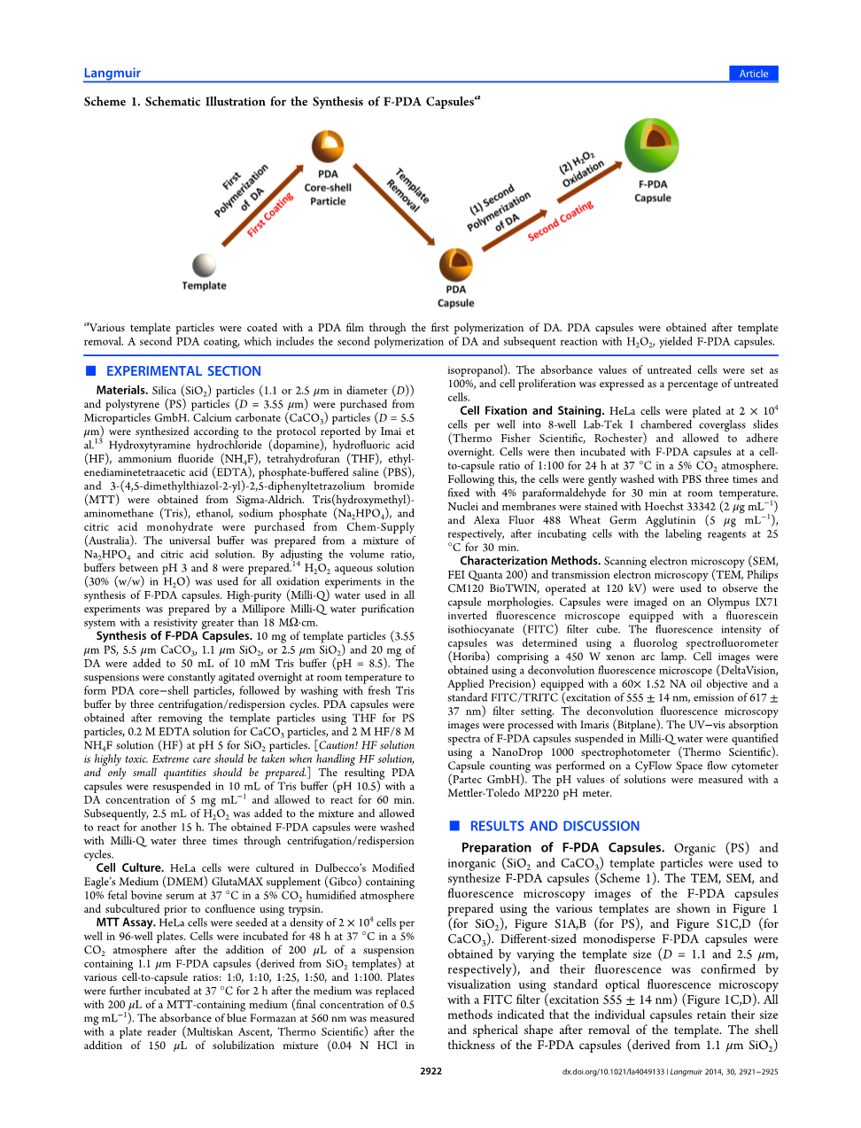 通过第一次聚合,用PDA薄膜涂覆各种模板颗粒。模板去除后获得PDA胶囊。第二个PDA涂层,包括DA的二次聚合和随后与H2O2的反应,产生了F-PDA胶囊。