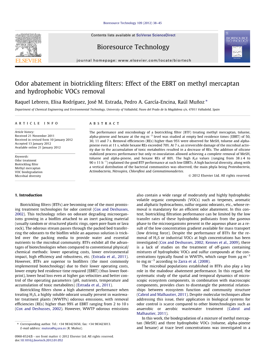 文献题目:Odor abatement in biotrickling filters: Effect of the EBRT on methyl mercaptan and hydrophobic VOCs removal