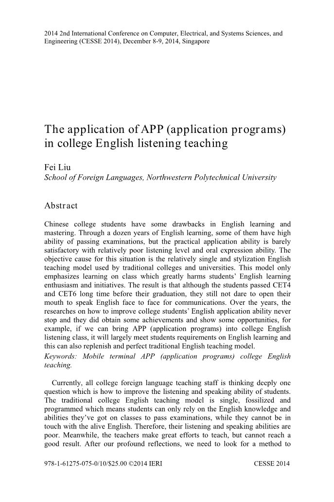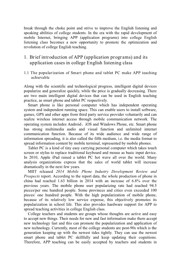 - [2] Brief Probe into APP Application on College English Teaching. HU Xi, Science Tribune, 30th issue, 2013