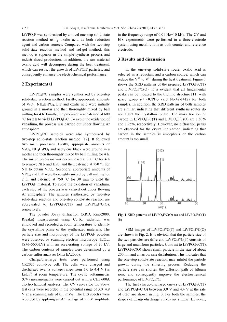 通常,制备LiVPO4F的方法主要基于两步固相反应法和溶胶-凝胶法。两步固相反应法比较复杂,需要先合成中间体VPO4,再与LiF反应合成最终产物LiVPO4F。除此以外,利用两步固相反应法难以合成高纯度的LiVPO4F,且由此得到的LiVPO4F的粒径较大、不均匀,导致其电化学性能较差。而由溶胶-凝胶法得到的LiVPO4F粒径较小、电化学性能良好,但因为该方法不仅耗财而且耗时,很难投入工业生产。在本论文中,以草酸作为还原剂和碳源,一步合成了LiVPO4F。与两步法和溶胶-凝胶法相比,一步法合成过程更简单,更适于工业生产。另外,草酸在加热时易分解,产生的碳有效地抑制了LiVPO4F材料的团聚,从而提高了电化学性能。